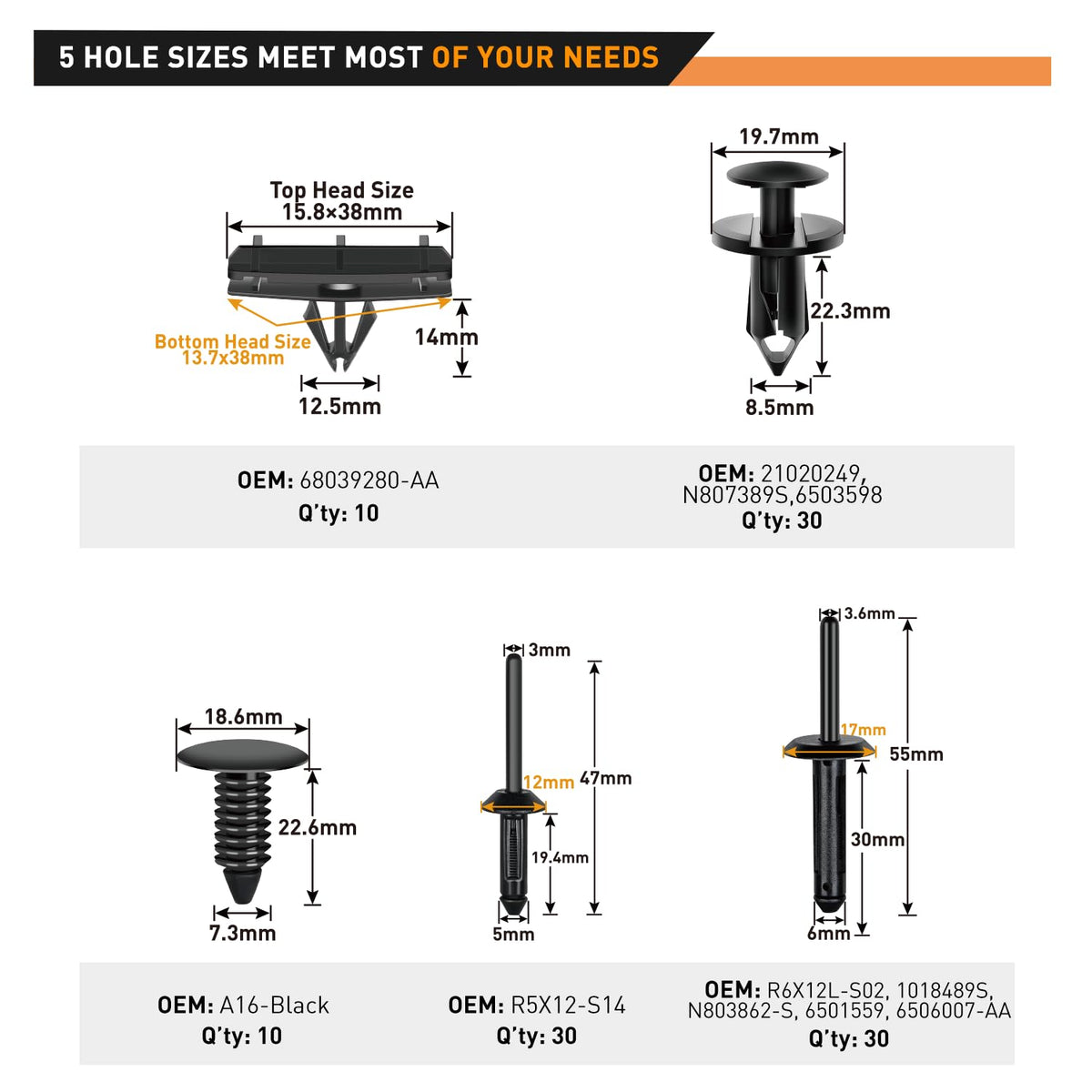 Q: How many pieces are included in the GOOACC bumper clip set?A: The GOOACC bumper clip set includes a total of 110 pieces, which consists of 5 different types of fastener rivets and 1 fastener remover, all conveniently packaged in a plastic box.