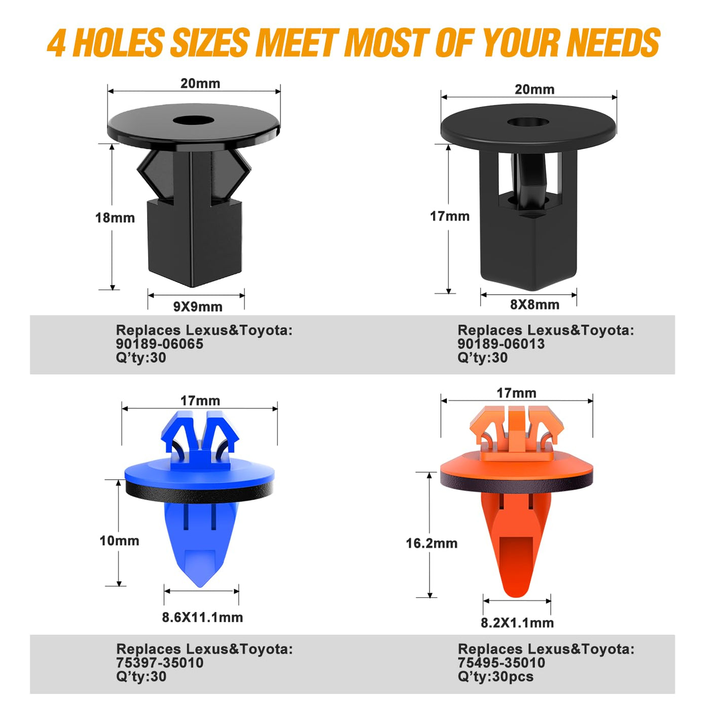 Q: What are the dimensions of the clips in this kit?A: The kit includes various clip sizes, such as 30Pcs with a head diameter of 17mm and stem length of 16.2mm, and other clips with a head diameter of 20mm and a stem length of 18mm, suitable for different installation needs.