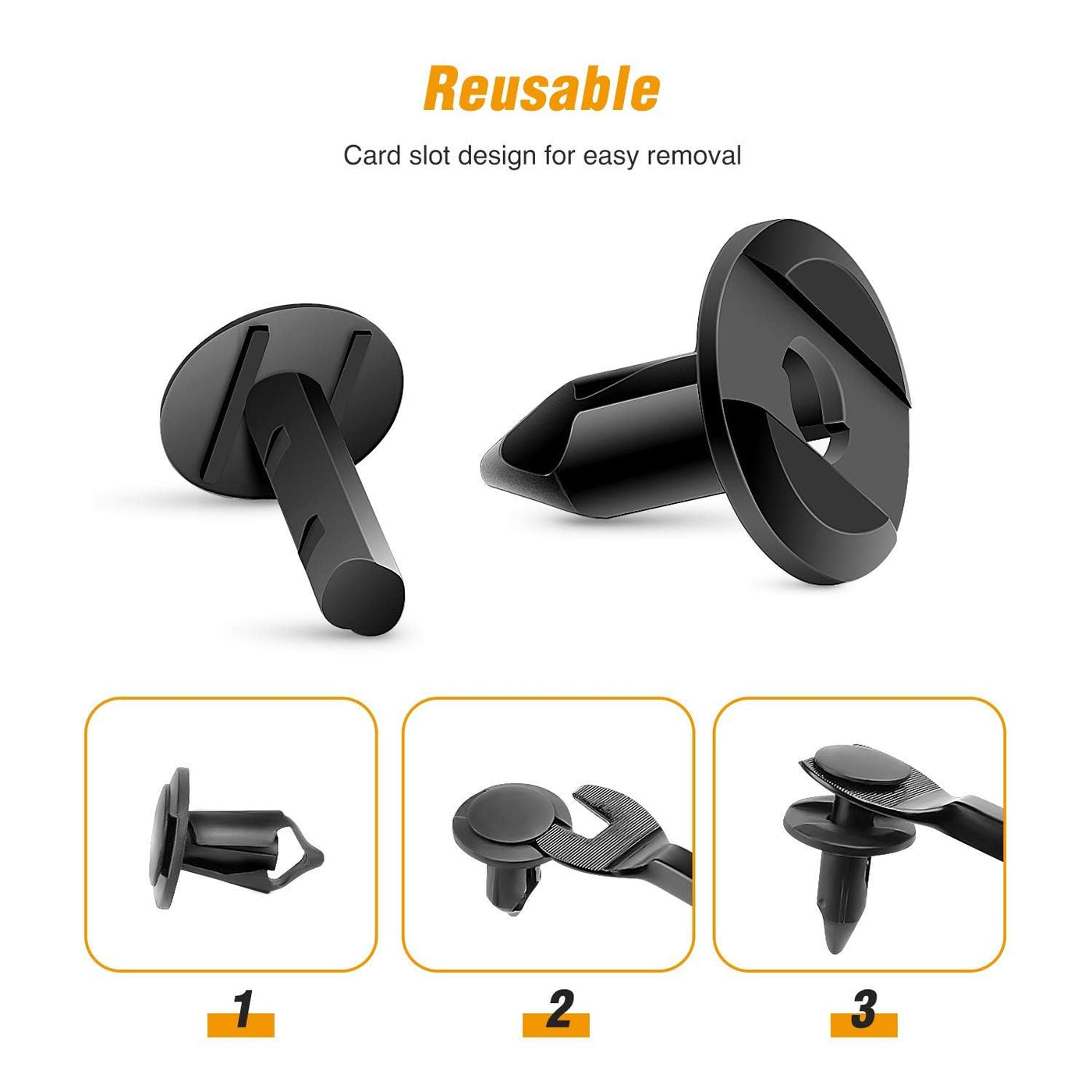 4 Hole sizes from 6.3Mm(1/4''), 8mm(5/16'' ), 9mm(23/64'' ), 10mm(25/64'' ). | Fits Most Popular Makes And Models: 91512-SX0-003, 14019205, 34201621,91503-SZ3-003, 91503-SZ5-003,N807389S, 21030249,6503598,52161-02020,52161-16010 | Widely Application: Utilized extensively for trim panel clips, door trim clips, door Panel clips, bumper clips, fender clips, engine cover and splash shield retainers replacement. It always covers some applications include telecom equipment, motor vehicles, domestic appliances, furniture and electrical equipment. | Great Material: these bumper clips are made of nylon material, anti-wear and anti-corrosion, would not break or crack easily during use. | Pakage Included: 120PCS 6.3mm 8mm 9mm 10mm Bumper Push Rivet Clips