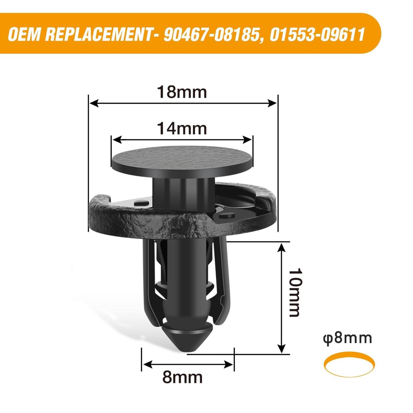?Oem Quality?-Made Of High-Quality Nylon Material, These Push-Type Bumper Clips Area Perfect Replacement For 90467-08185, 01553-09611. | ?Perfect Fit?-The Same Size And Shape As The Original Clips, With A Head Diameter: 18Mm (23/32''), Stem Length: 12Mm (15/32''), Fits In Hole: 8Mm (5/16''). | ?Applicable Models?-Fits 2004-2010 Scion Tc, 2004-2010 Scion Xa, 2004-2010 Scion Xb, 2000-2010 Toyota 4Runner, 2000-2010 Toyota Celica, 2000-2010 Toyota Corolla. | ?Applicable Models?-Fits 2000-2010 Toyota Echo, 2000-2010 Toyota Matrix, 2000-2010 Toyota Prius, 2000-2010 Toyota Rav4; 1997-2003 Lexus Es300, 2004-2006 Lexus Es330, 2001-2005 Lexus Is300. | ?Great Value?-Our Package Includes 25Pcs Push-Type Bumper Clips To Ensure You Have Enough For Your Project.