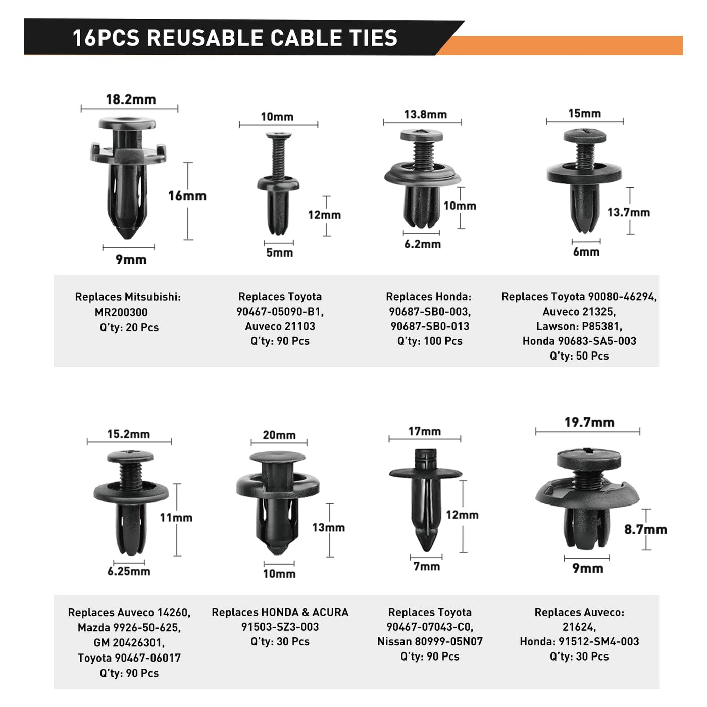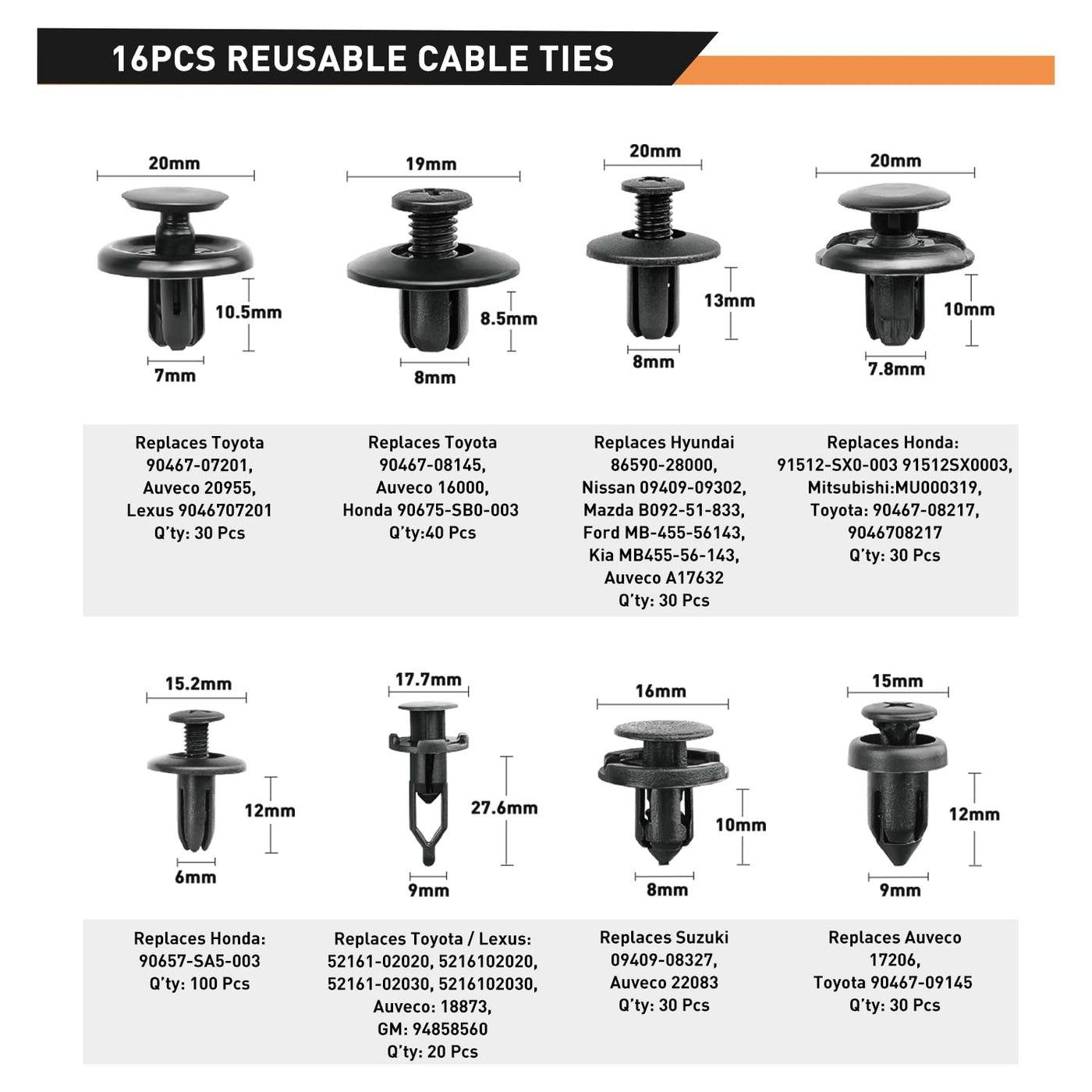 Material: Made Of High-Quality Nylon Materialfits Gm, Ford, Chrysler, Toyota, Honda, Nissan, Mazda, Chevy, Jeep Etc.Suitable For Car Use Better Replacement For Original Parts.Push In Type, Easy To Fasten Bumper Fender Flare And Mud Flap. Rivet Post Pressure Expands Legs For Fast And Tight Fastening.Package: 810Pcs Fuel Line Retaining Clips, 5Pcs Fastener Removers, 30Pcs Sponge-Cushion And 10Pcs Cable Ties