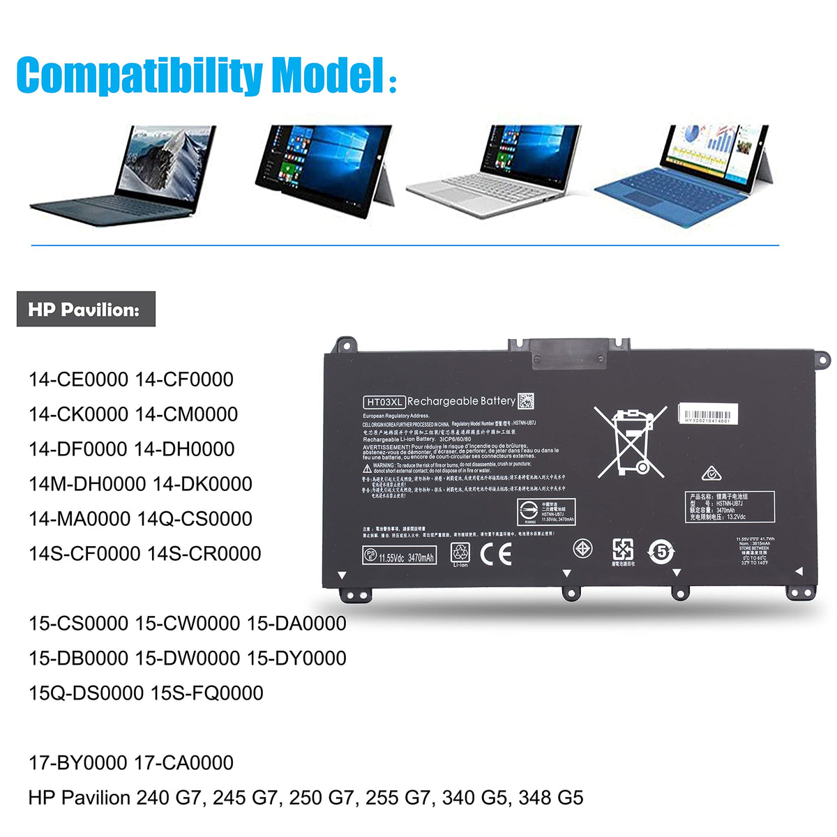 Q: What laptops are compatible with the HT03XL Battery?A: The HT03XL Battery is compatible with a wide range of HP Pavilion laptops, including models from the 14 and 15 series such as the HP Pavilion 14-CE, 14-CF, 14-CM, 15-DA, 15-DB, 15-DW, and 17-CA series. It supports various sub-models, ensuring a fit for many configurations.
