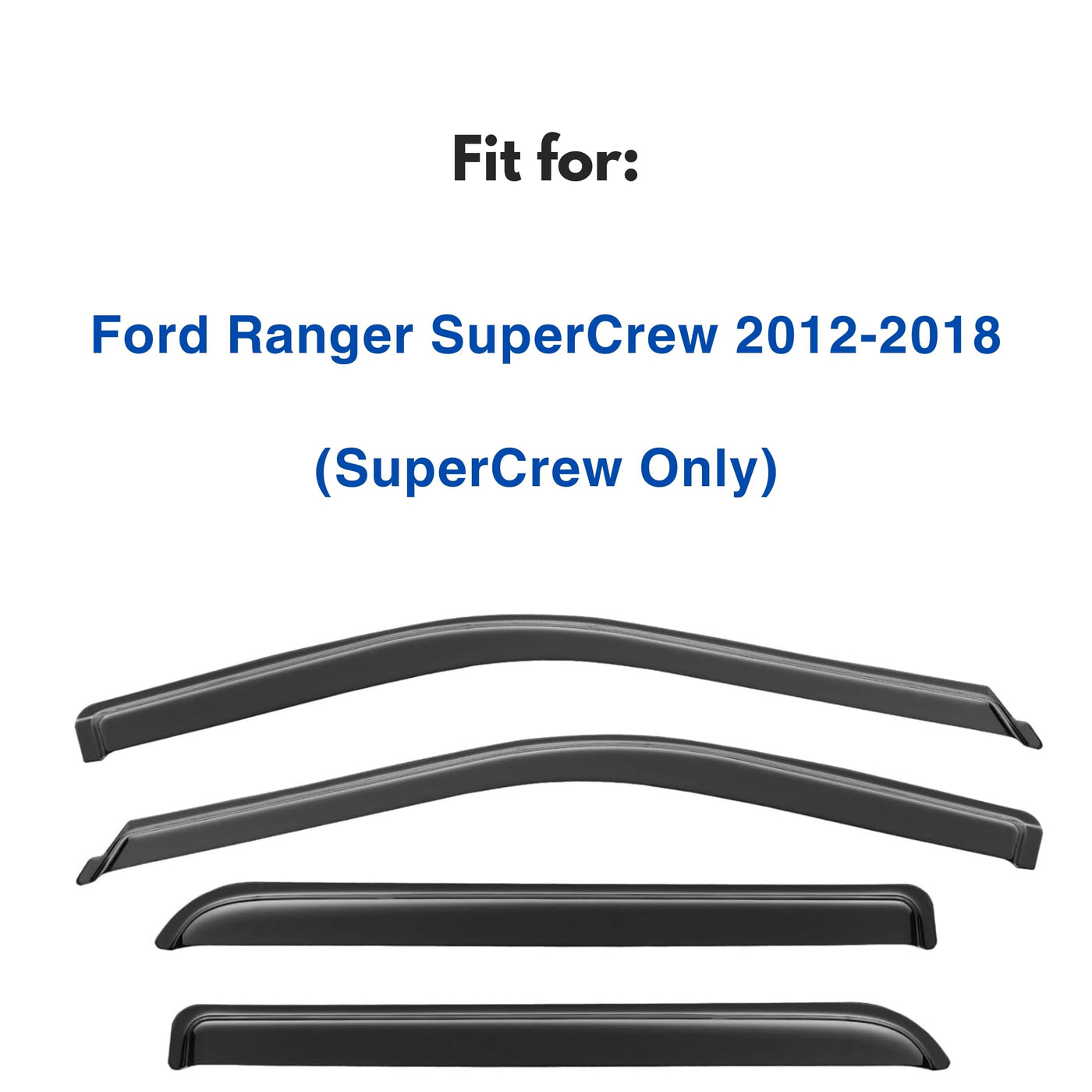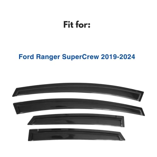 Q: Are these window visors compatible with all Ford Ranger models?A: These window visors are specifically designed to fit the Ford Ranger SuperCrew models from 2019 to 2024. They are not compatible with other body styles.