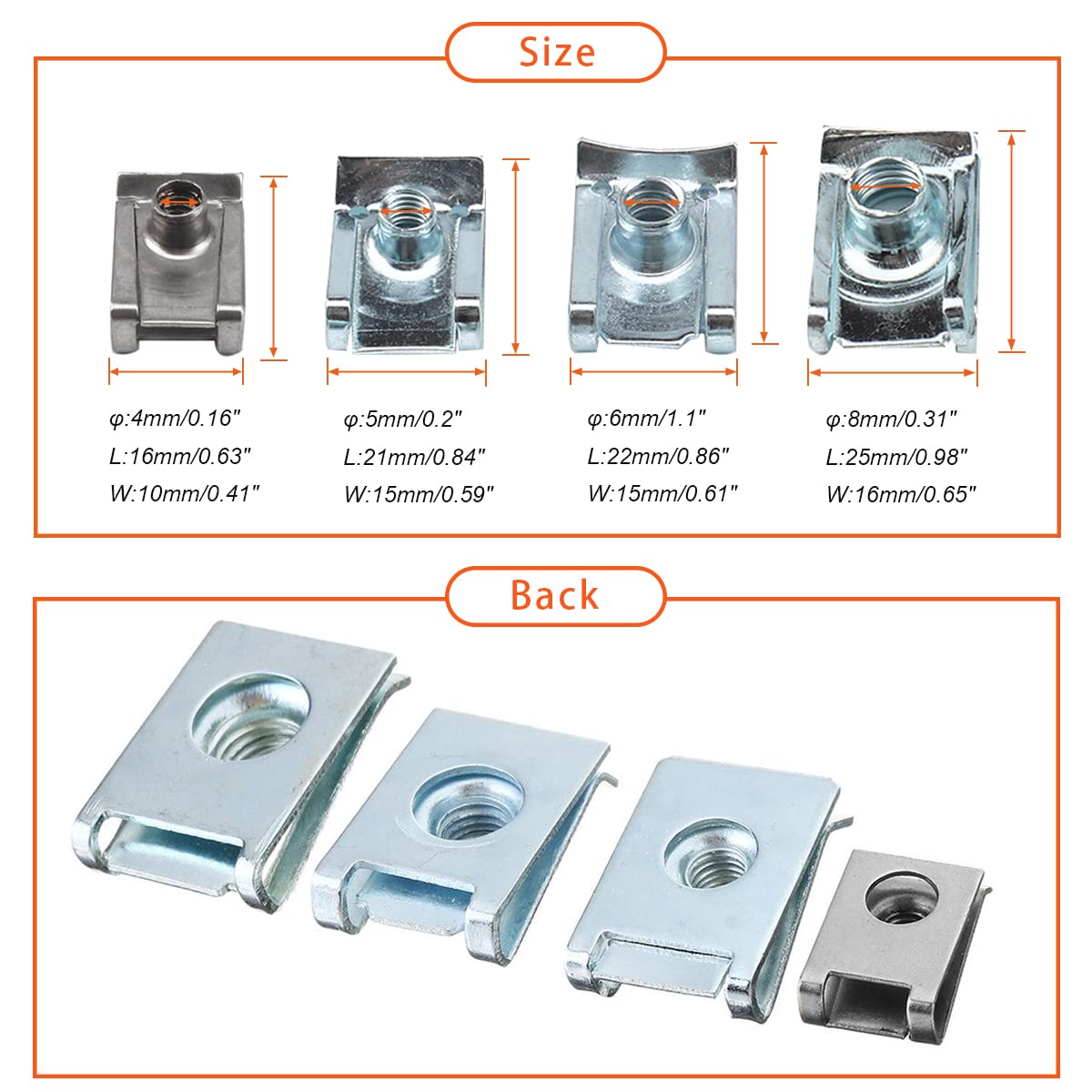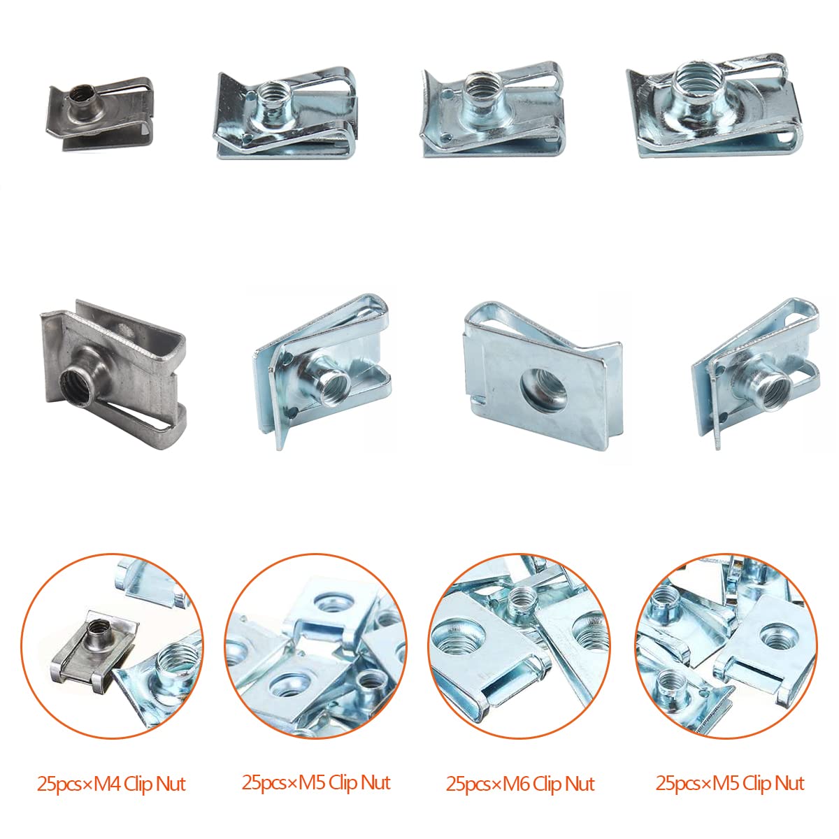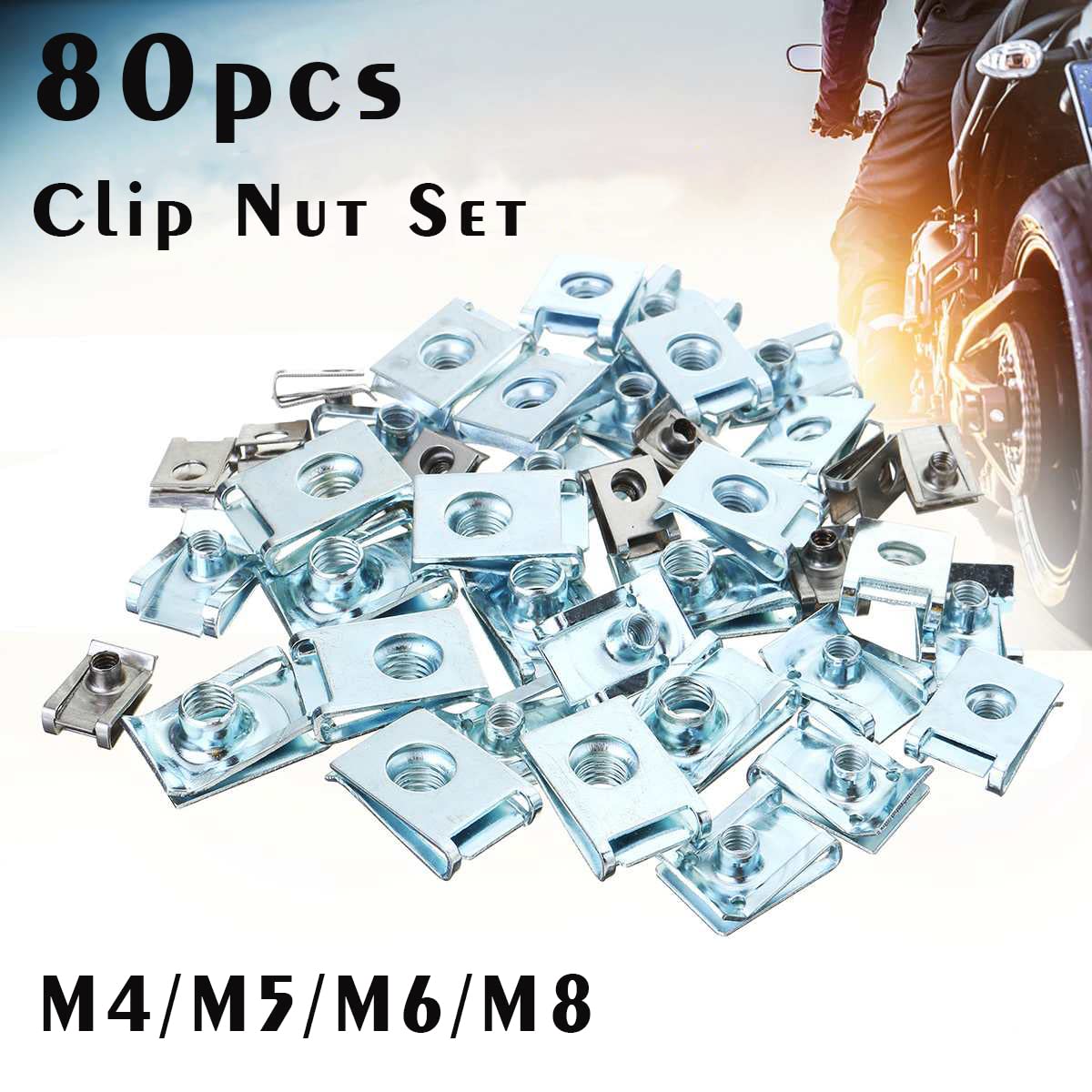 Q: What sizes of U-Nuts are included in the kit?A: The kit includes a total of 80 pieces with the following sizes: 25 M4 Clip Nuts, 25 M5 Clip Nuts, 15 M6 Clip Nuts, and 15 M8 Clip Nuts, making it versatile for various automotive applications.