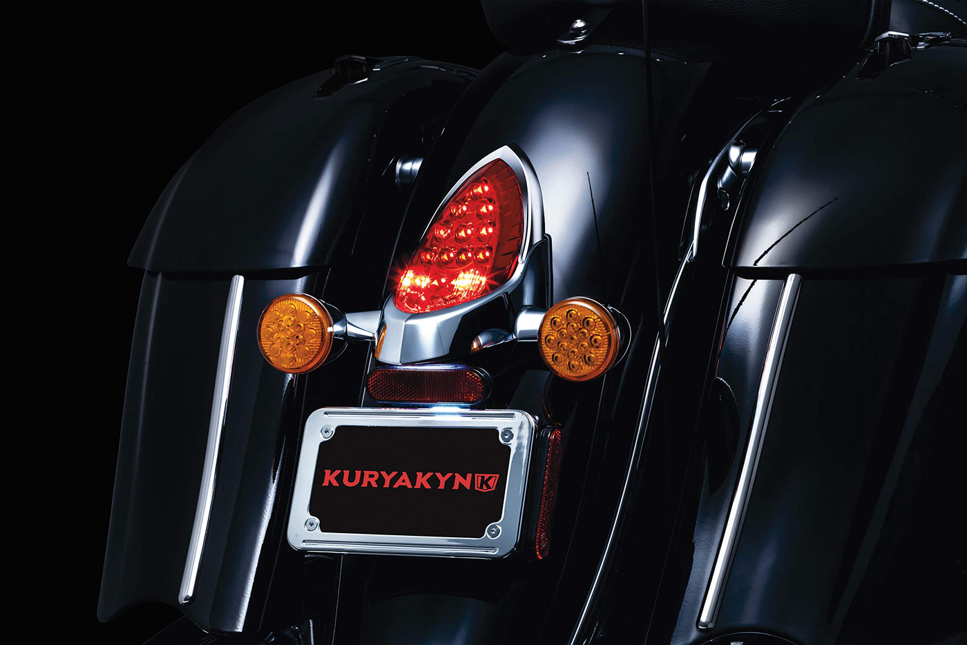 Q: What material is the Kuryakyn 7697 Tail light Top Trim made of?A: The Kuryakyn 7697 Tail light Top Trim features a chrome finish, providing durability and a sleek appearance.