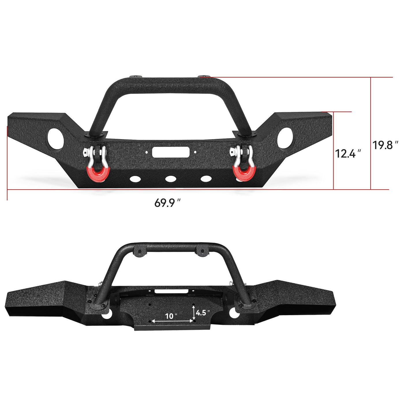 ?Perfect Fitment?Compatible with 2007-2018 Jeep Wrangler JK and JK Unlimited models, including 2-door and 4-door models. | ?Maximum Protection?The full-width bumpers protect fender flares as well as the front of your vehicle. | ?OEM Fog Lights Housing?Features built-in fog lights housing to directly install your OEM fog lightswith no modifications needed. Fog lights not included, you will need to buy a wiring extension for your fog lights. | ?Shackle Mount and D-rings?Two solid D-ring shackle mounts are welded onto the front bumper for additional strength. Total capacity is 9000 lbs. with the two 4.75 Ton D-Rings. Built-in winch plate has weight capacity ofup to 12,000 lbs (winch not included). Offers a great place to mount a winch and efficient vehicle recovery. | ?Corrosion Resistant Finish?E-coat and premium textured-black powder coating grant long-lasting corrosion resistance.