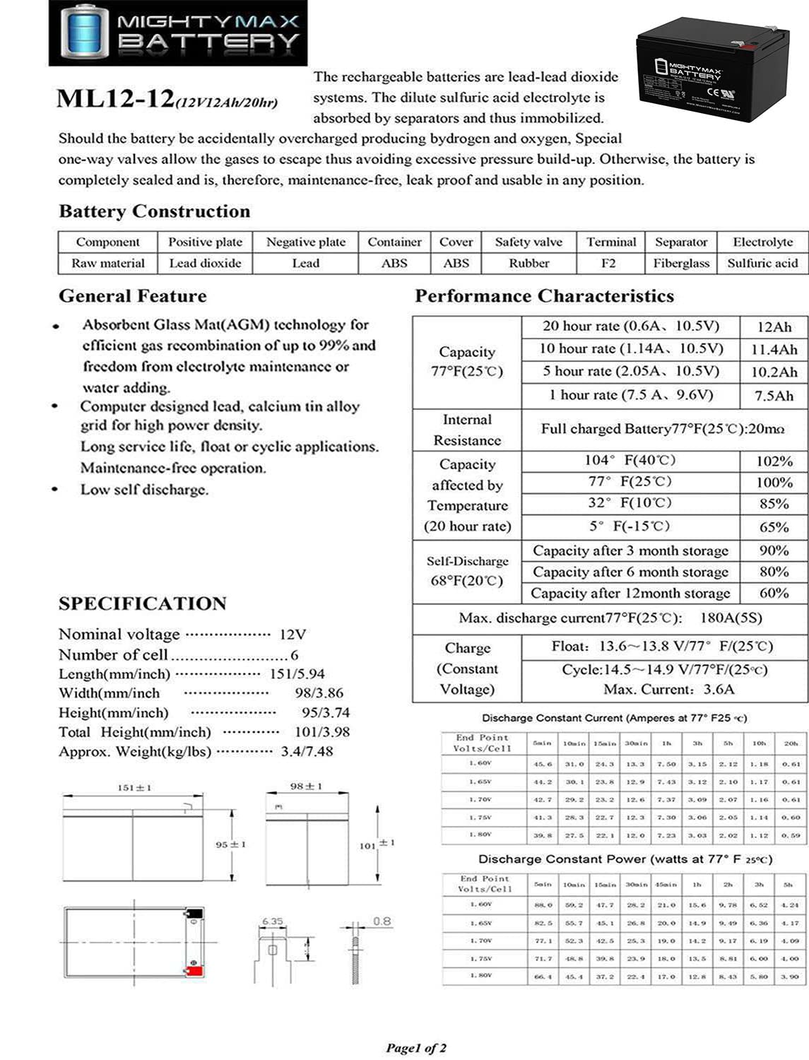 Q: What are the dimensions of the Mighty Max Battery 12V 12AH?A: The dimensions of the Mighty Max Battery 12V 12AH are 5.94 inches in length, 3.86 inches in width, and 3.98 inches in height.