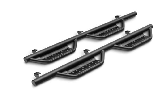 Q: What materials are used in the construction of these Nerf steps?A: These Nerf steps are made from durable steel with a black textured powder coat finish, ensuring long-lasting performance and resistance to wear and tear.