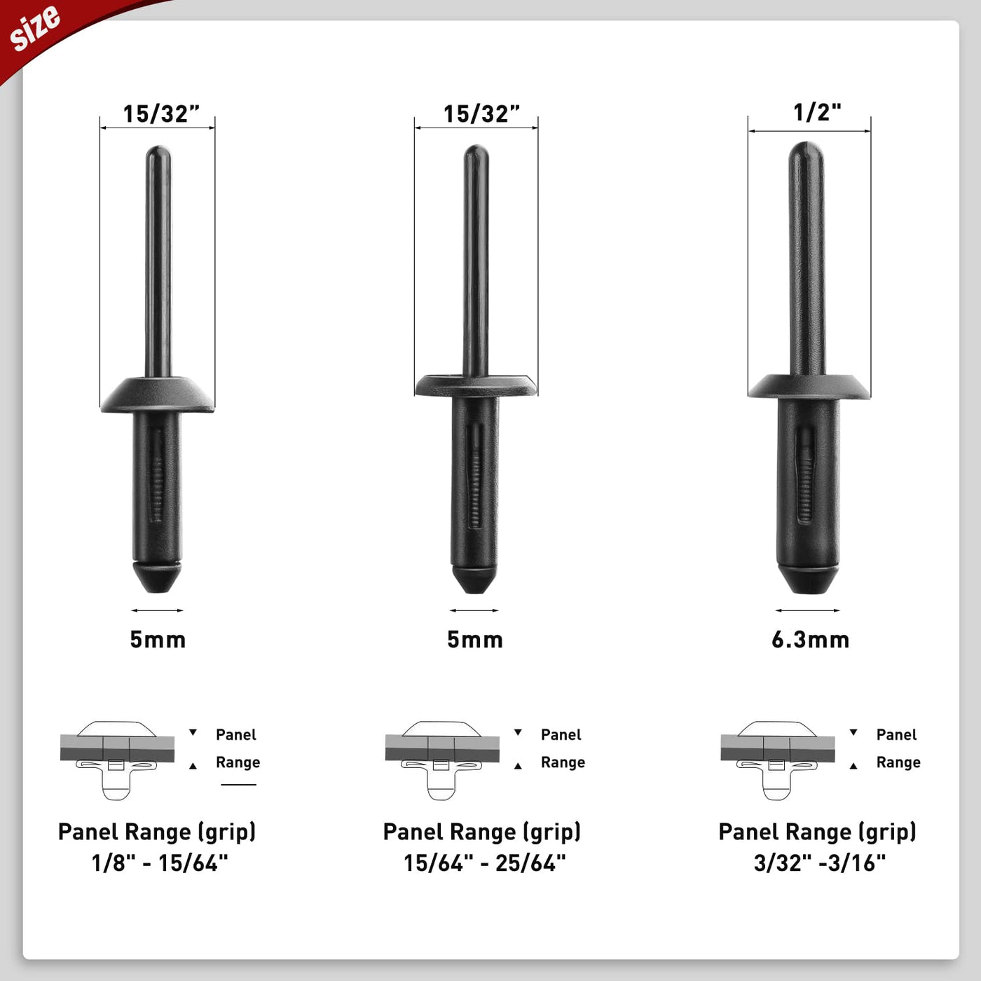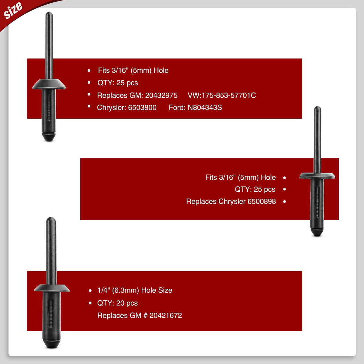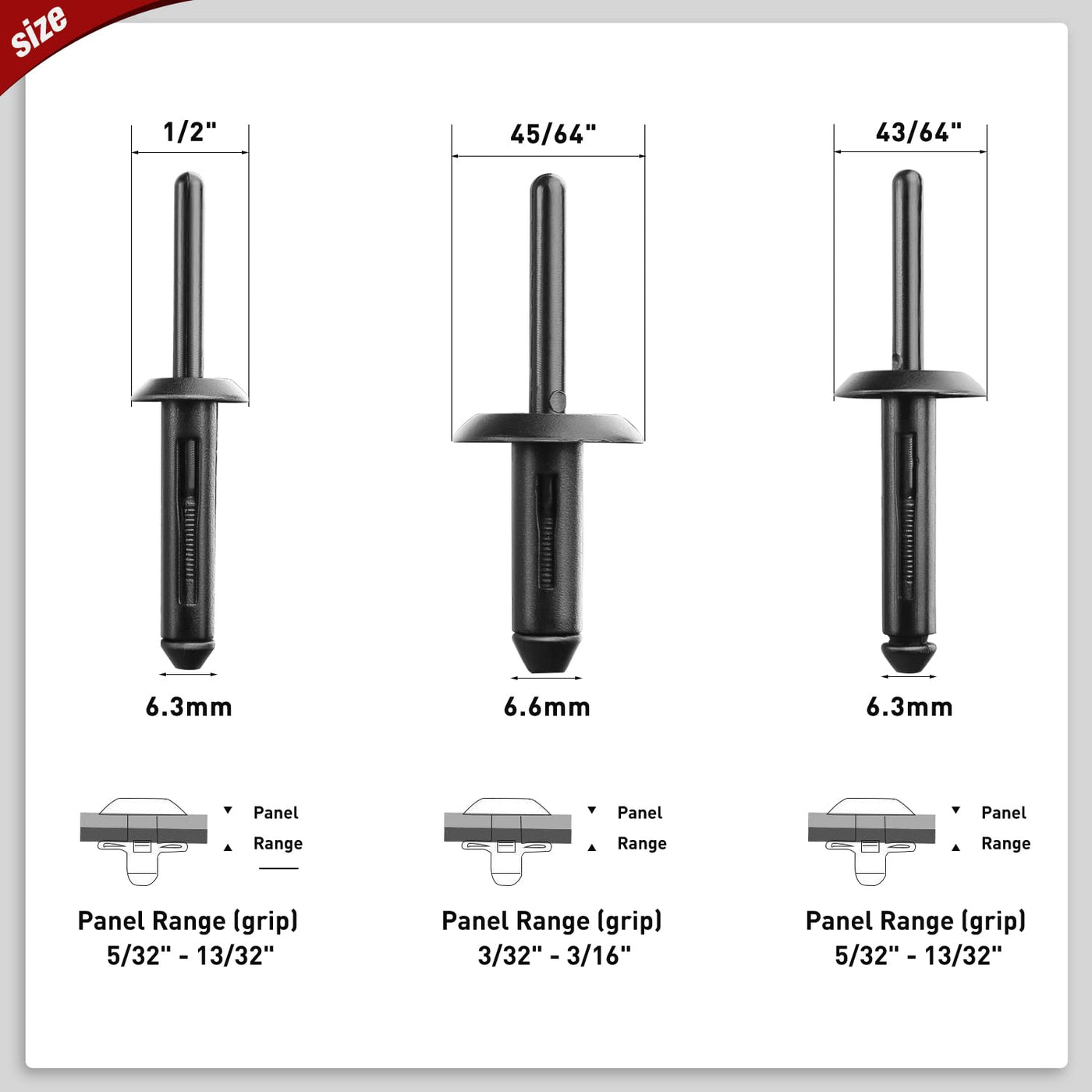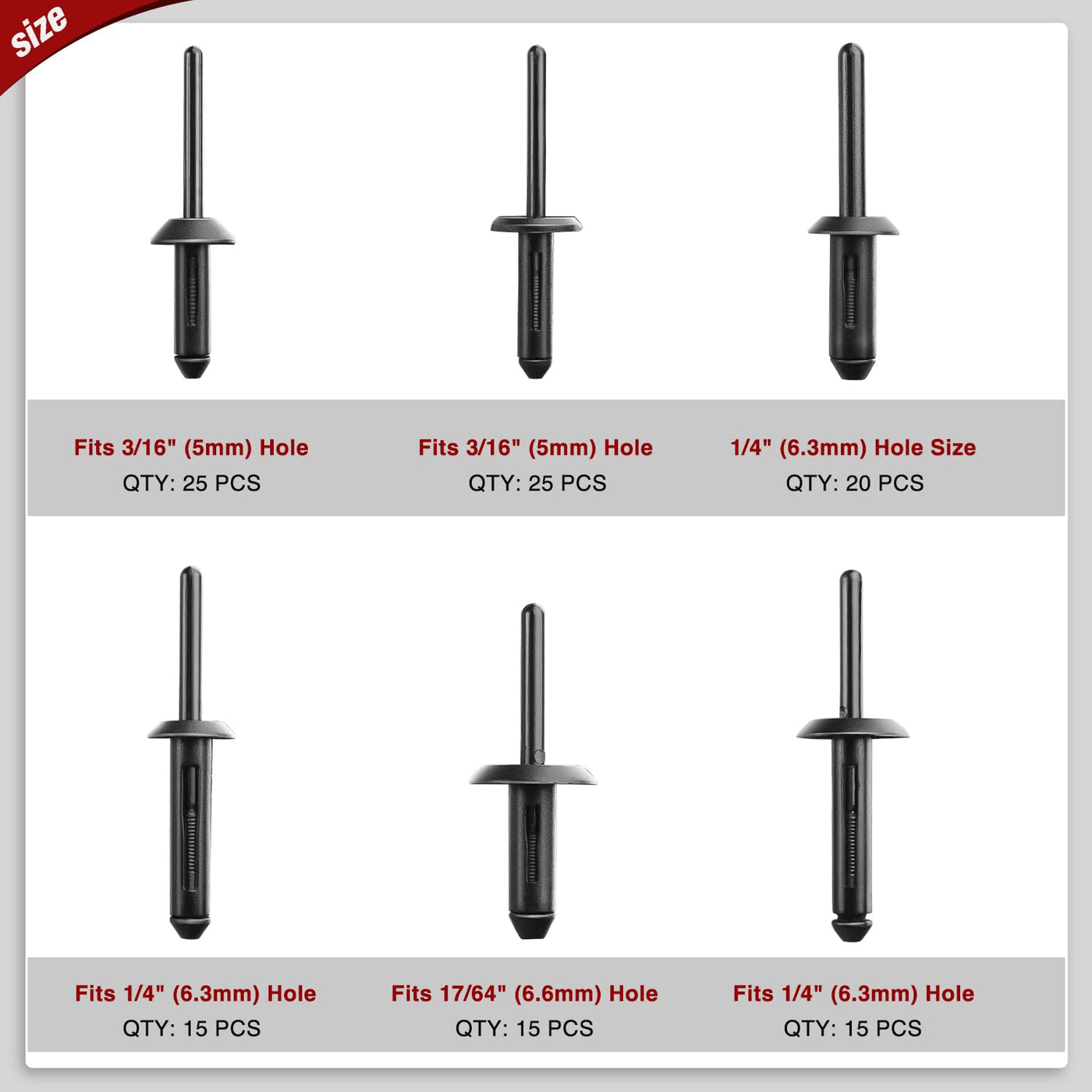 Nilight 115Pcs 6 Sizes Universal Pop Rivet Assortment Rivet Clip Black Nylon Blind Rivets Compatible With Gm Ford Chrysler Vw 2
