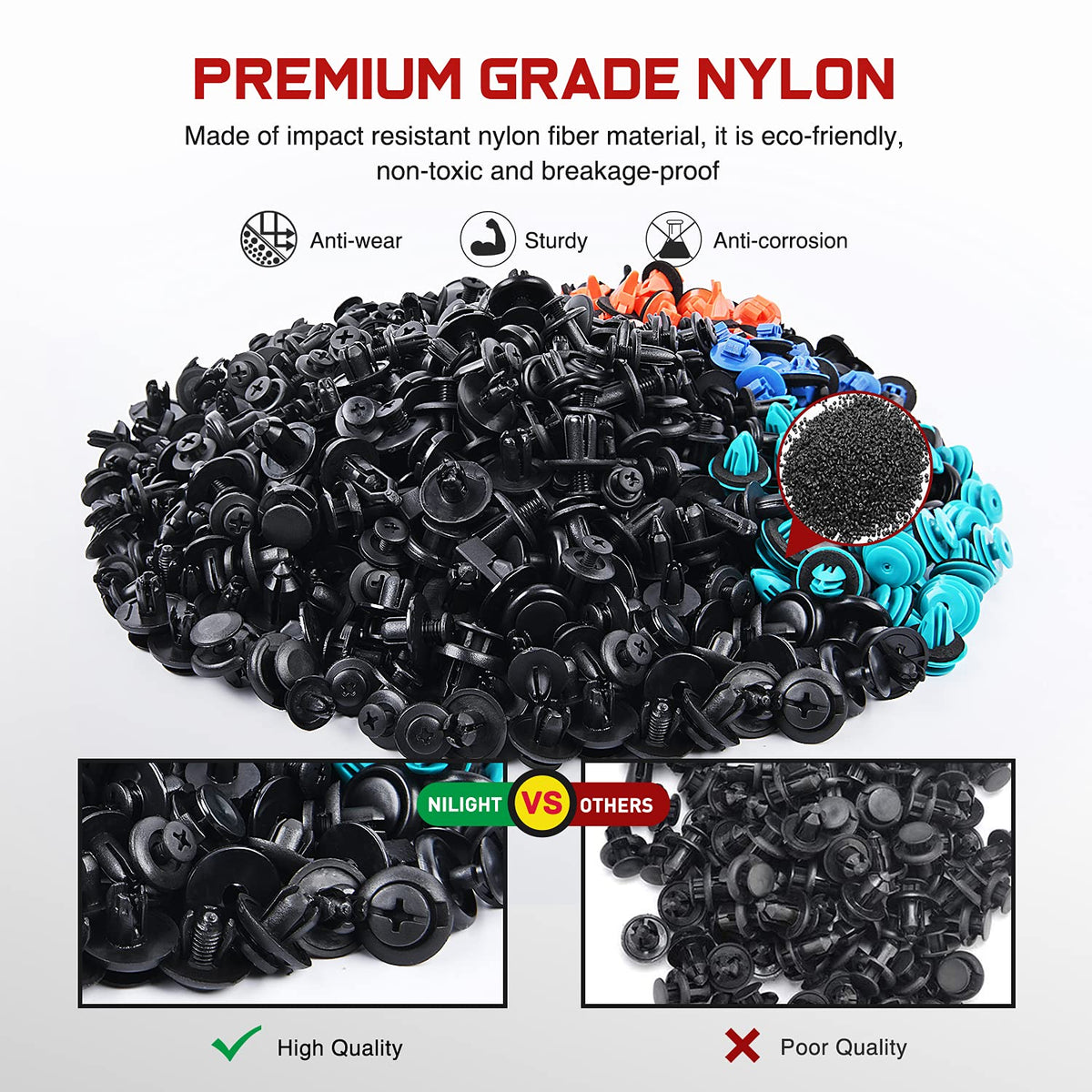 Q: Are these clips made from durable materials?A: Yes, the Nilight clips are made from high-quality nylon, ensuring durability and resistance to breaking or cracking during use. This heavy-duty construction is ideal for automotive applications where reliability is essential.