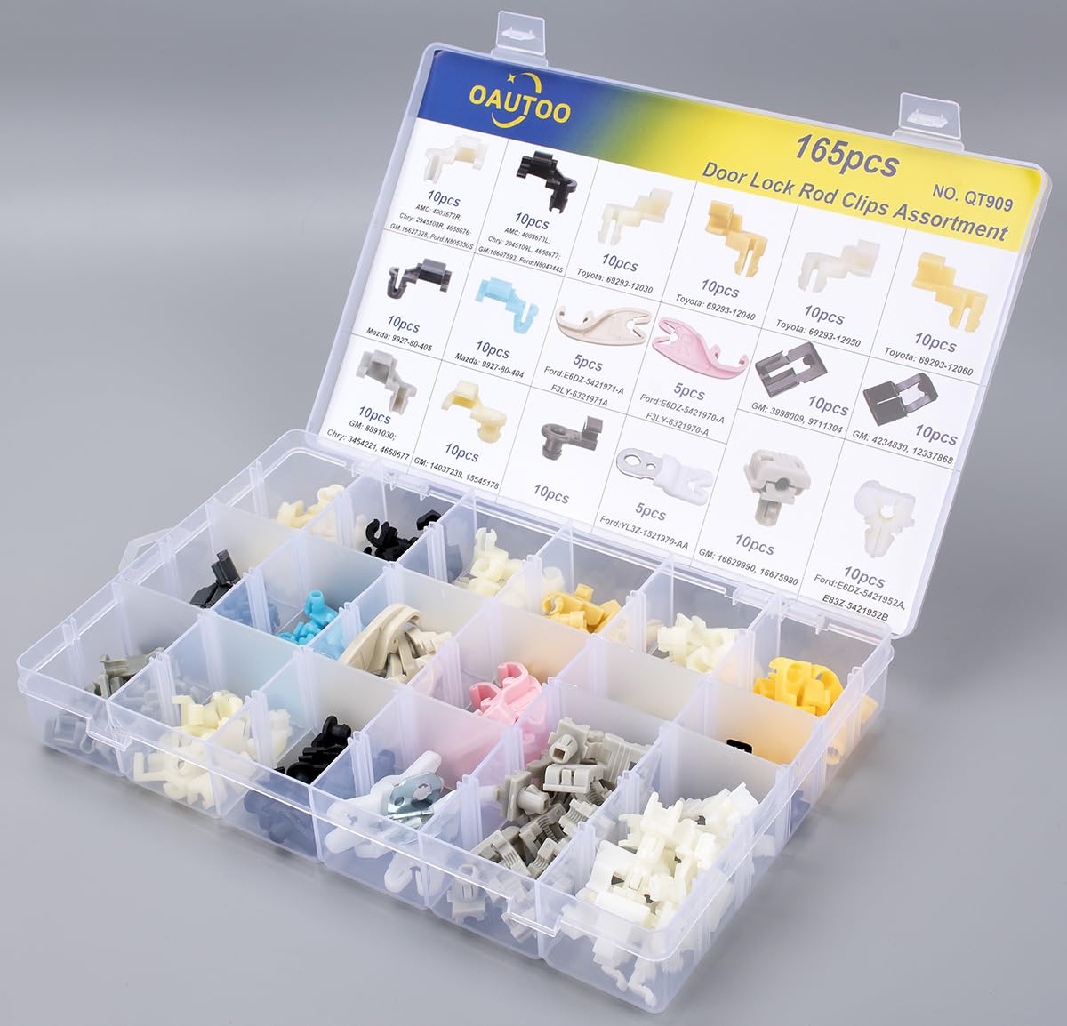 Q: How many different sizes of clips are included in this assortment?A: This assortment includes a total of 18 different sizes of door lock rod clips, providing multiple solutions for various replacement needs. With 165 pieces in total, it ensures you have the right clip for your specific application.