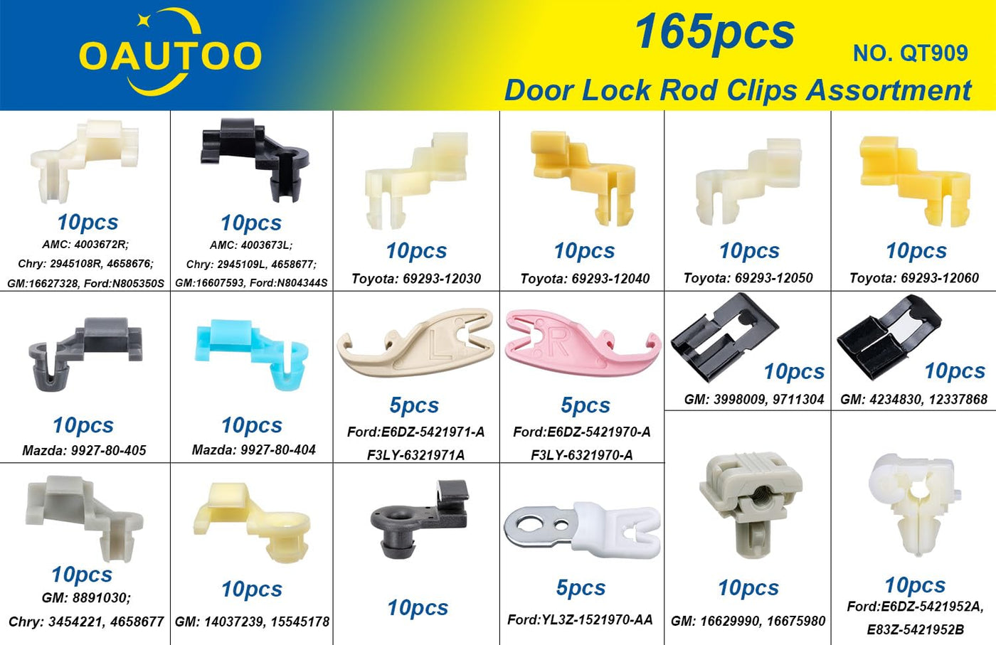 Q: What types of vehicles are compatible with the OAUTOO 165pcs Door Lock Rod Clips?A: The OAUTOO 165pcs Door Lock Rod Clips are designed to fit a wide range of vehicles, including popular brands such as GM, Ford, Chrysler, Toyota, and Mazda. Specific models include the Ford Taurus, GM Trucks, and various Toyota models like the Camry and RAV4.