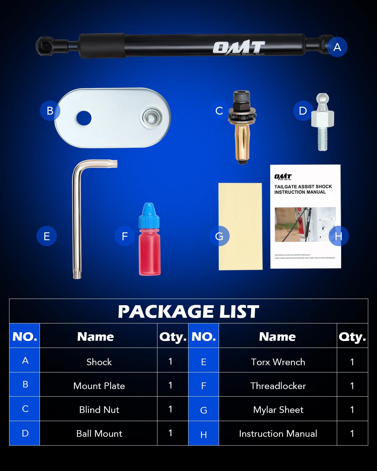Package List 1 X Tailgate Assist Shock 1 X Mount Plate 1 X Ball Mount 1 X Rivet Nut Tool 1 X Threadlocker 1 X Torx Wrench 1 X Mylar Sheet 1 X Instruction Manual