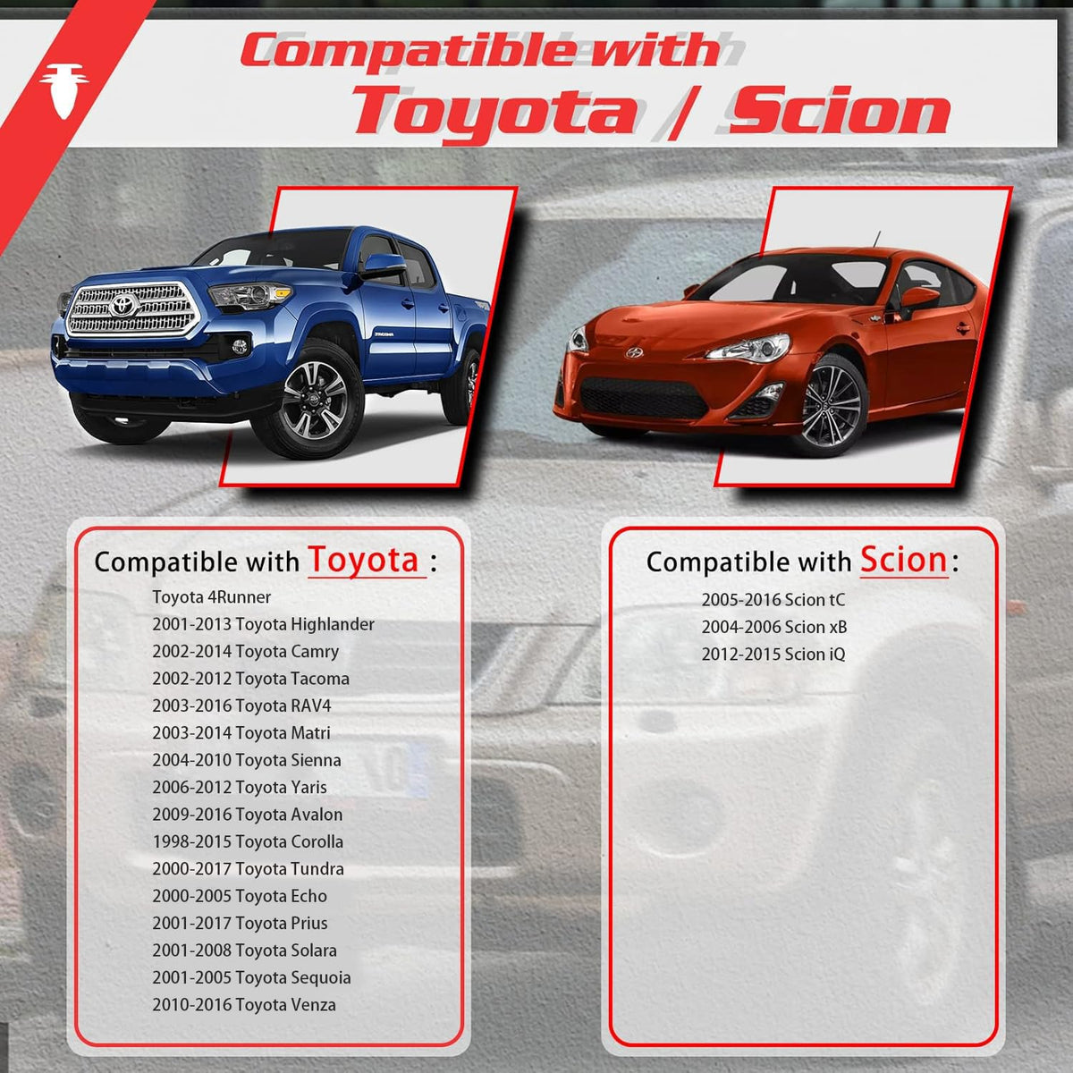 Door Panel Clips ensure that your car's body panels are free from dirt and moisture, efficiently saving them from corrosion and deformation. OTUAYAUTO Advanced Nylon Fasteners Clip Vehicle Fitment: Scion 2012-2013 Scion iQ 2005-2014 Scion tC 2004-2006 Scion xB Toyota 2010-2014 Toyota 4Runner 2013-2014 Toyota Avalon 2002-2014 Toyota Camry 1998-2015 Toyota Corolla 2000-2005 Toyota Echo 2001-2013 Toyota Highlander 2003-2008 Toyota Matrix 2001-2014 Toyota Prius 2006-2014 Toyota RAV4 2001-2005 Toyota Sequoia 2004-2010 Toyota Sienna 2004-2008 Toyota Solara 2008-2012 Toyota Tacoma 2000-2005 Toyota Tundra 2012-2014 Toyota Venza Package includes: 50PCS Car Clips You will be glad you have a 50 of them, because when you break one, then you don't have to go down to your local automotive shop.