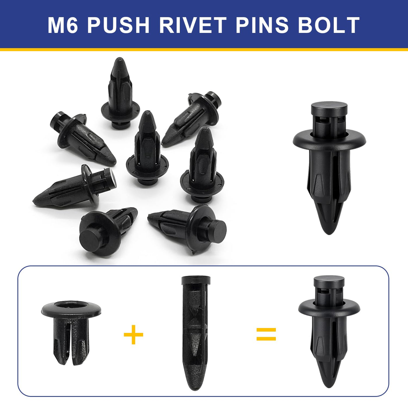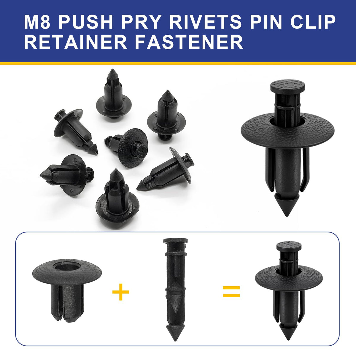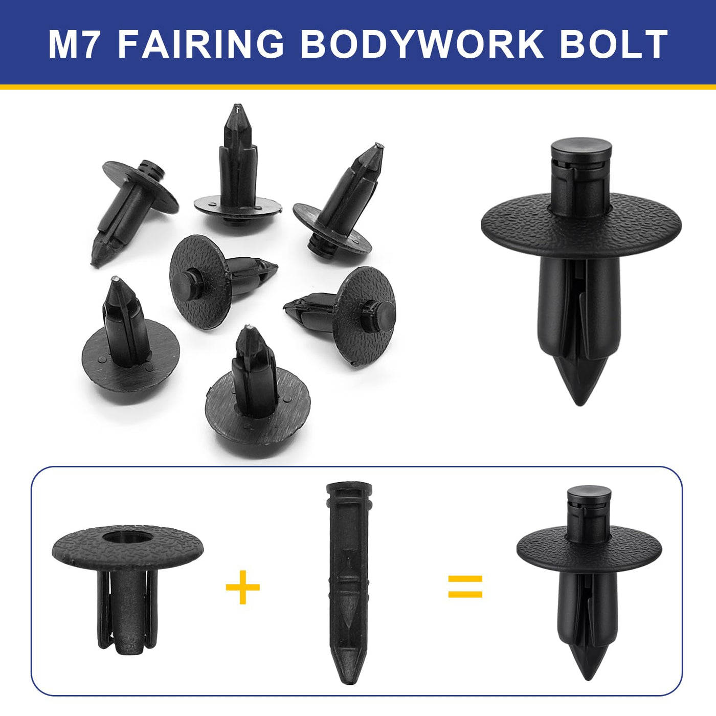 Upgrade Your Ride with Professional-Grade Fasteners Stop wasting time hunting for mismatched clips! This 120-piece kit delivers the exact plastic rivets and push pins used by Polaris, Honda, Kawasaki, Suzuki, and Yamaha technicians. Engineered for a factory-tight snap-in fit, these UV-stabilized nylon fasteners withstand mud, trail vibrations, and extreme temperatures without cracking. Why This Kit Beats Hardware Store Parts: ?? Vehicle-Specific Sizing M6 (8mm head): Perfect for motorcycle front fairings and ATV radiator shrouds M7 (10mm head): Matches 90% of Japanese sport bike bodywork M8 (12mm head): Heavy-duty fender/grille retention on UTVs 7661855: Direct Honda TRX650/TRX680 & Polaris Sportsman 450-570 replacement ?? Proven Compatibility Fixes loose panels on: Fit for Honda: Rancher, Rubicon, Foreman, Rincon Fit for Polaris: Sportsman 450/500/550/570 Fit for Suzuki/Yamaha: YZF-R series, GSX-R fairings, ATV fender liners Works Where Duct Tape Fails Reattach flapping fenders, secure cracked fairings, or silence rattling heat shields in minutes. Includes enough clips to refurbish 2-3 vehicles - ideal for home mechanics or riding clubs. Push Retainer Kit with 4 popular sizes, compatible with many UTV, ATV, Motorcycle, Bike, and Snowmobile, be used for holding on radiator yoke. Specification: M6 Size: Head Diameter: 11.5mm; StemLength: 11.5mm; Fits Into: 6mm hole M7 Size: Head Diameter: 18.3mm, StemLength: 16.3mm, Fits Into: 7mm hole M8 Size: Head Diameter: 19.4mm, StemLength: 15.3mm, Fits Into: 8mm hole 7661855 Size: Head Diameter: 14.8mm, StemLength: 21mm, Fits Into: 9mm hole