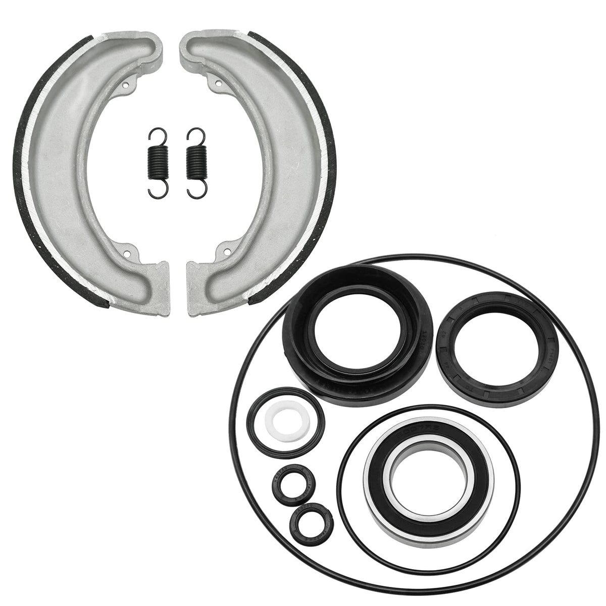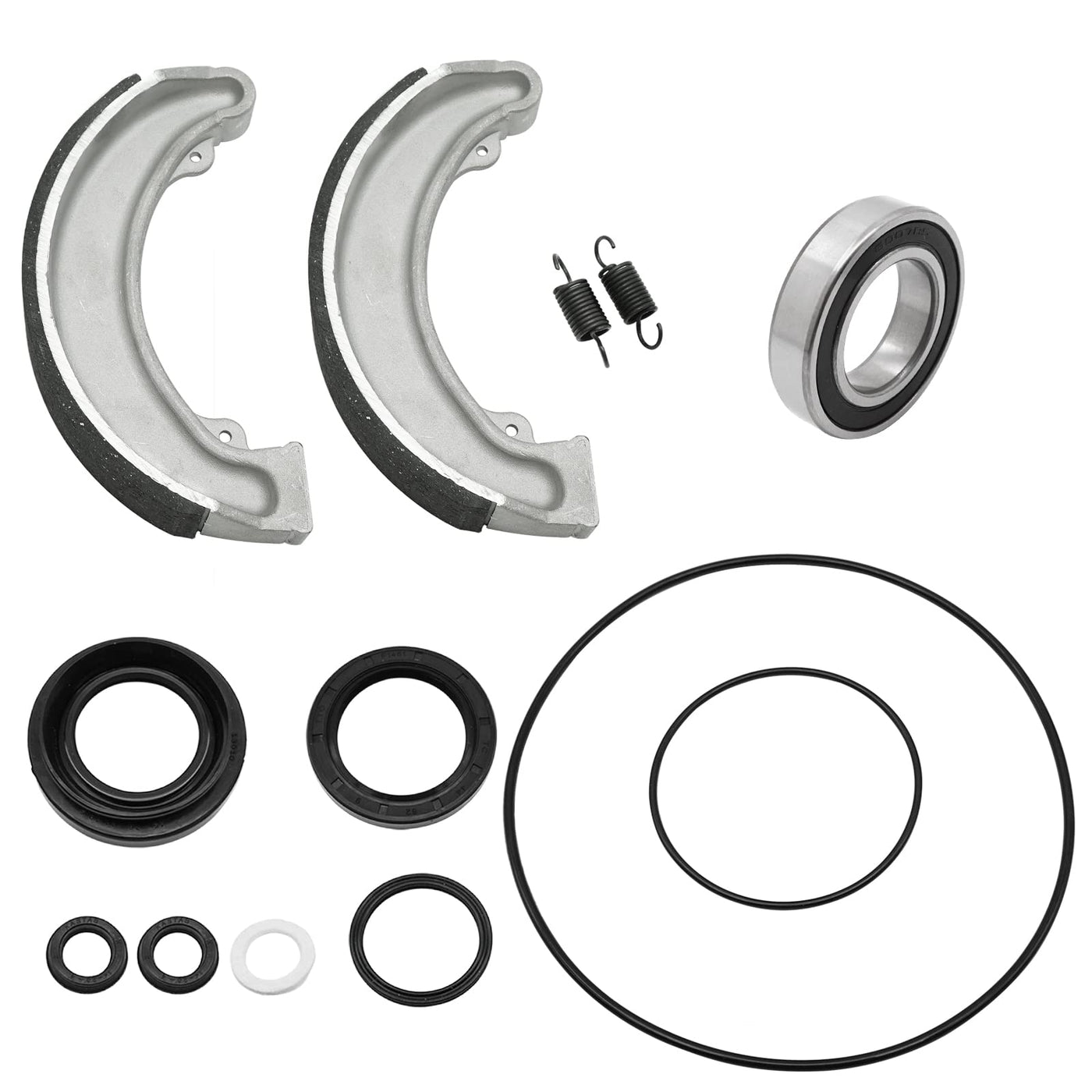 Q: What materials are used in the brake shoes and seals of this kit?A: The brake shoes in this kit are made from 100% non-asbestos friction formulations for durability, while the bearing is constructed from long-lasting steel. The seals and O-ring kits are made from durable rubber to ensure longevity and effective performance.