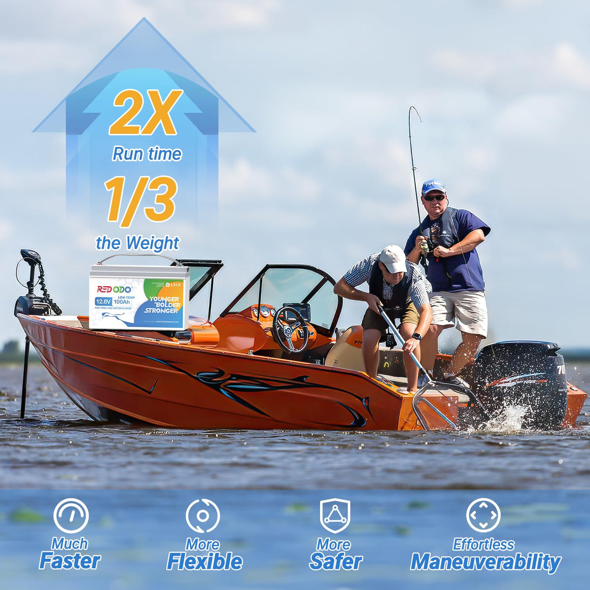 About Redodo Lithium Iron Phosphate Battery This high-quality powerful 100ah lifepo4 battery low temp is an excellent replacement or upgrade for Gel, AGM or Flooded Lead Acid battery. This battery is suitable for a wide range of uses, both indoors and outdoors, especially for trolling motor, marine, boat, kayak. Specifications Maintenance Free Nominal Voltage:12.8V Rated Capacity (0.2C): 100 Ah / 1280Wh Cycle Life: > 4000 cycles at 100% Depth of Discharge (DOD), up to 15000 cycles at 60% DOD Rated Voltage: 12.8V Charge Voltage: 14.4 - 14.6V (Max. per cell: 3.65V) Cut-off Voltage: 10V Depth of Discharge (DoD): 100% Standard Charge Current: 20A Charging Time: approximately 5 hours Max Continuous Charge Current: 100A Max Continuous Discharge Current: 100A Peak Discharge Current: 280A (for 5 seconds) Operating Temperatures: charge 0C~50C, discharge -20C~60C, storage -10C~50C Battery Terminals: M8 Connection Tips: (Details will be listed in product manual) Our battery can be connected in parallel and series for larger capacity. Connect in series: Up to 4 identical batteries for up to 48V. Connect in parallel: between identical batteries - Voltage difference between the batteries must be less than 0.5V. It can support fast charging and solar panel charging.