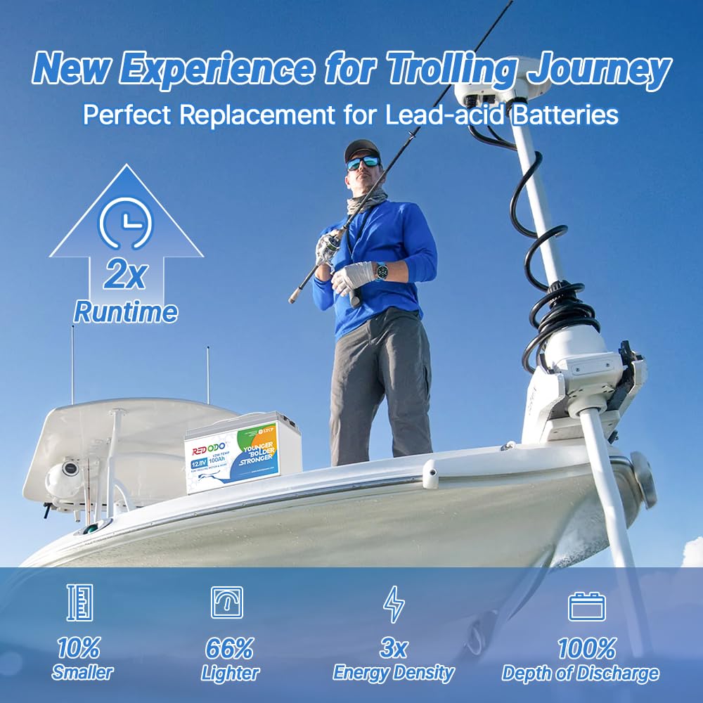 About Redodo 12V Trolling Motor Battery Why do you need a lithium boat batteries 12v designed specifically for your needs? 1. Professional marine lithium battery do professional things to bring you a better experience during your leisure time 2. Upgraded BMS with waterproof, salt-resistant, and corrosion-resistant protection and low-temperature cut-off function, so you don't have to worry about anything. 3. Lighter weight, very convenient to carry. Product features of the 100ah lifepo4 battery 1. Suitable for traction motor 2. Supports low-temperature cut-off 3. Designed with a 100A BMS and A-grade battery 4. Low-temperature cut-off 5. Waterproof, salt-resistant, and corrosion-resistant Specifications of the lightweight trolling motor battery Nominal voltage: 12.8V Nominal capacity: 100Ah Battery management system: 100A Cycle life: 4000+ Protection level: IP65 Fits your needs: Supports up to 4 serial and 4 parallel circuits for expansion Use scenarios Lithium batterie can be widely used for boats, RVs, solar systems, off-grid, camping, and home backup power systems, etc.