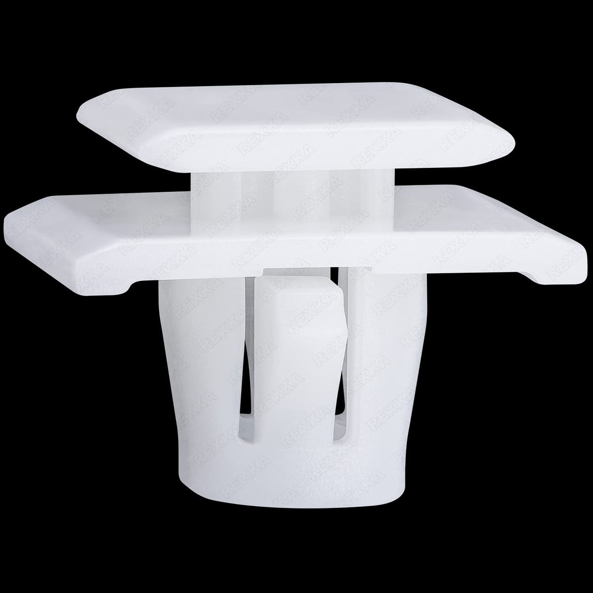 Q: What material is the Rexka weatherstrip clip made from?A: The Rexka Lower Outer Door Weatherstrip Clip is made from durable white nylon, which offers good resistance to wear and tear, ensuring longevity and reliability.