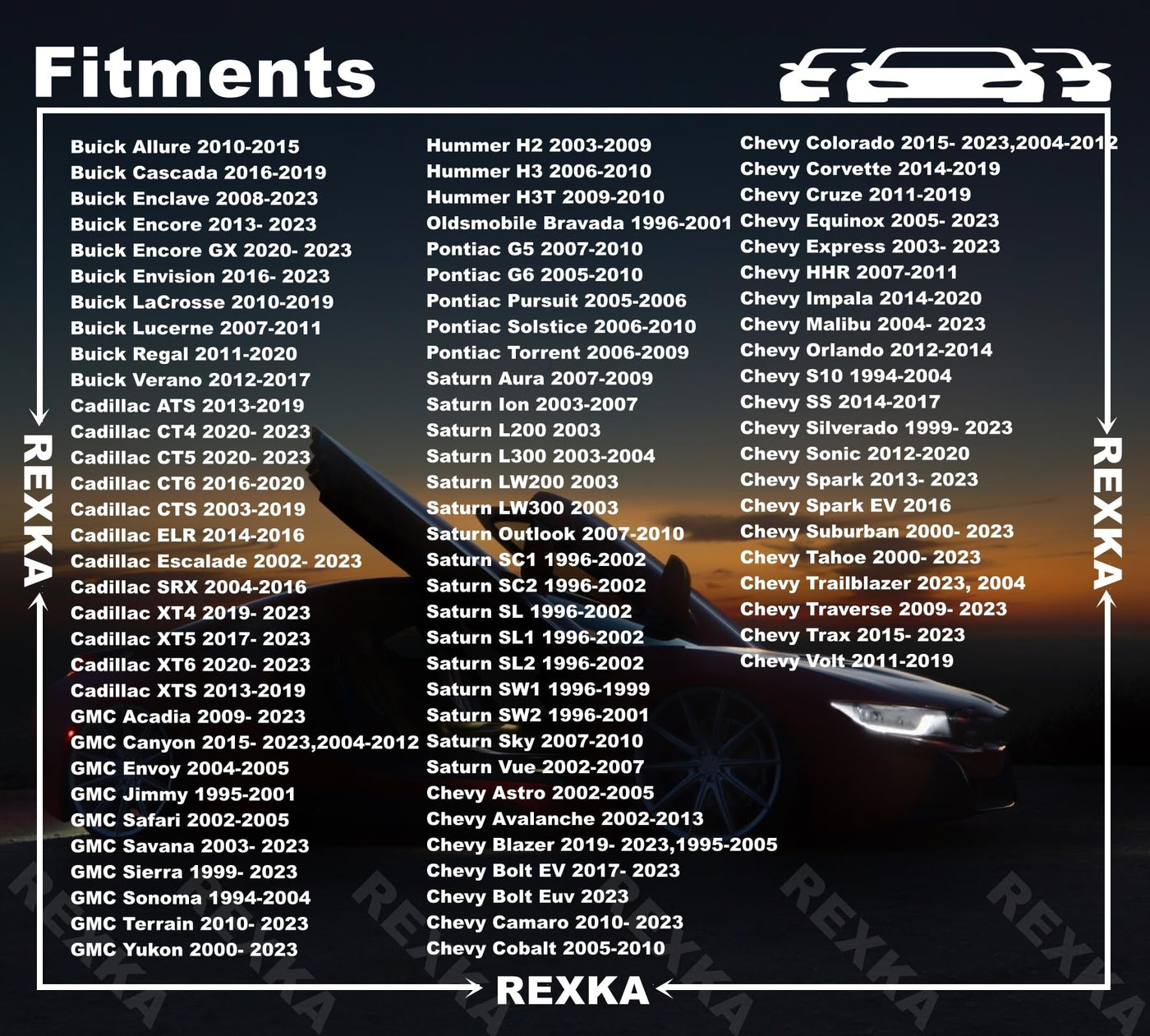 Q: What vehicles are compatible with the Rexka M4.2-1.41 Bumper Cover Fender Liner Screw Nut Kit?A: The Rexka M4.2-1.41 Bumper Cover Fender Liner Screw Nut Kit is compatible with a wide range of GM vehicles, including various models from Buick, Cadillac, GMC, Hummer, Saturn, and Chevy. Specific models include the Buick Enclave, Cadillac Escalade, GMC Sierra, and Chevy Silverado, among others.