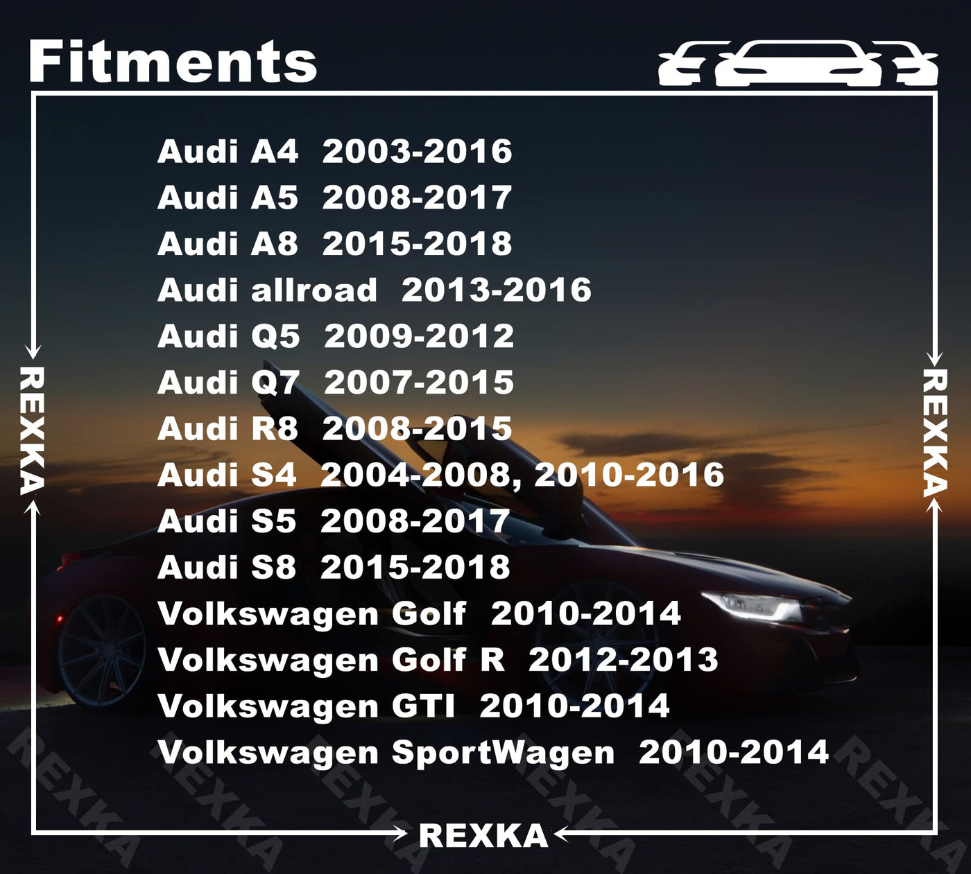Q: What vehicles are compatible with the Rexka Bumper Cover Fender Headlamp Assembly Bolt Screw?A: The Rexka Bumper Cover Fender Headlamp Assembly Bolt Screw is compatible with a variety of Volkswagen and Audi models including the Golf, Golf R, GTI, Jetta, A4, A4 Quattro, A5, A5 Quattro, A8 Quattro, allroad, Q5, Q7, R8, S4, and S5.