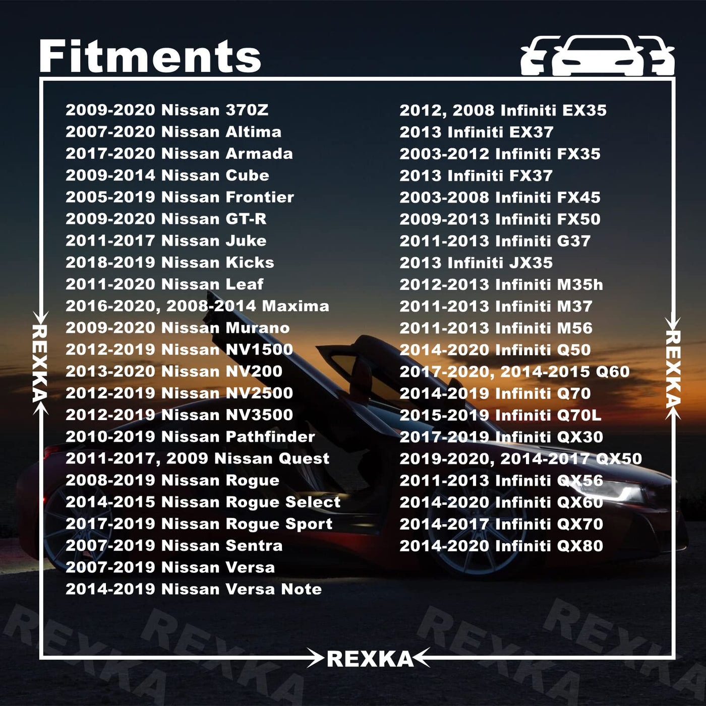 Q: What vehicles are compatible with the Rexka 20pcs Fender Liner Cowl Grille Bumper Under Cover Clip?A: The Rexka clips are compatible with a wide range of Nissan models including 370Z, Altima, Armada, Cube, Frontier, GT-R, Juke, Kicks, Leaf, Maxima, Murano, NV series, Pathfinder, Quest, Rogue, Sentra, and Versa, as well as various Infiniti models like EX35, FX series, G37, JX35, M series, Q series, and more.