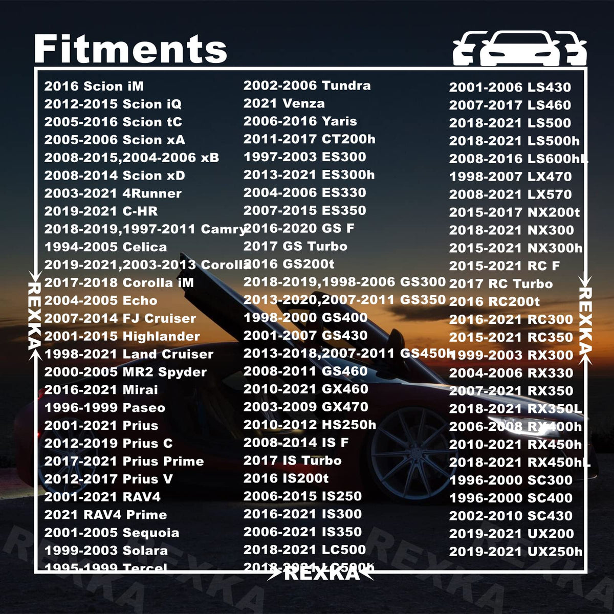 Q: What vehicles are compatible with the Rexka Fender Liner Bumper Cover Grille Retainer Clips?A: The Rexka Fender Liner Bumper Cover Grille Retainer Clips are compatible with a wide range of Toyota models including 4Runner, Avalon, C-HR, Camry, Corolla, FJ Cruiser, Highlander, Land Cruiser, and more. They also fit various Lexus models such as CT200h, ES300h, GS350, RX350, and others. For a complete list, please refer to the product specifications.