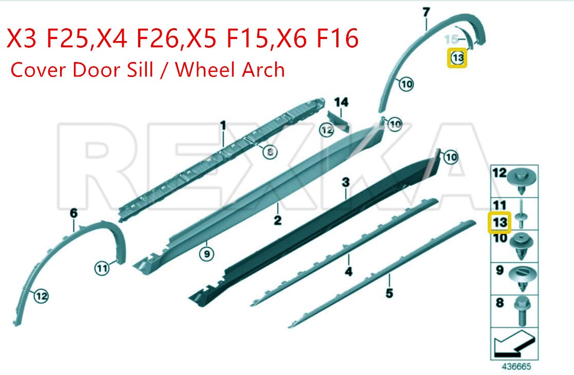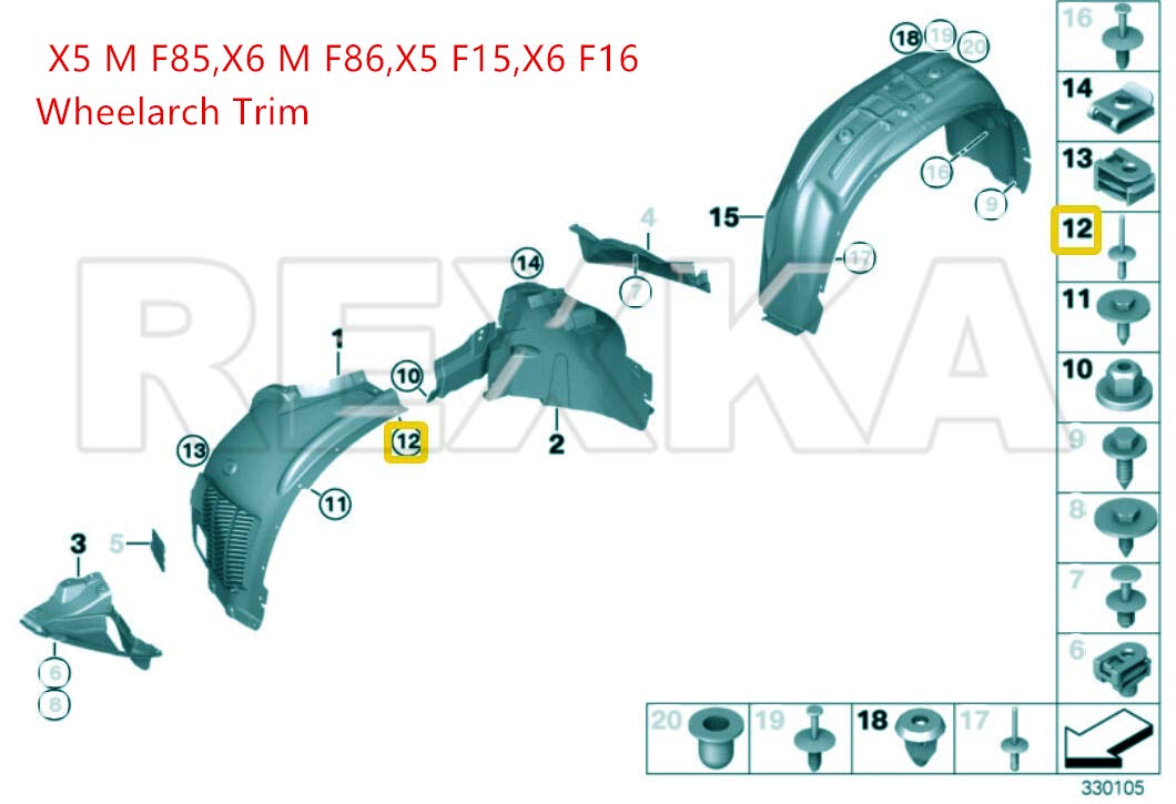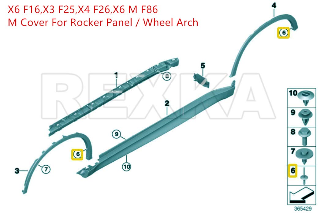 Q: What vehicles are compatible with the Rexka Wheel Flare Fender Liner Nylon Rivet?A: The Rexka Wheel Flare Fender Liner Nylon Rivet is designed to replace BMW part number 07147293278 and is compatible with models such as the X3 (F25), X4 (F26), X5 (F15), X6 (F16), and their respective M models.