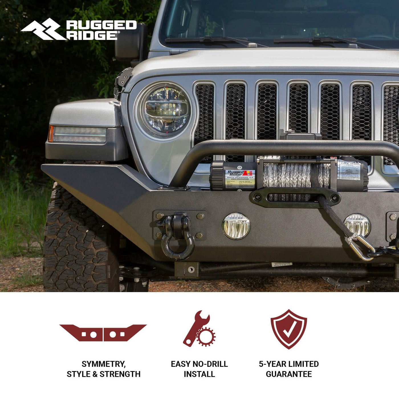 Q: What kind of warranty does the Rugged Ridge Spartan bumper come with?A: The Rugged Ridge Spartan bumper is backed by a five-year warranty, providing peace of mind with your purchase and assuring you of its quality and durability.