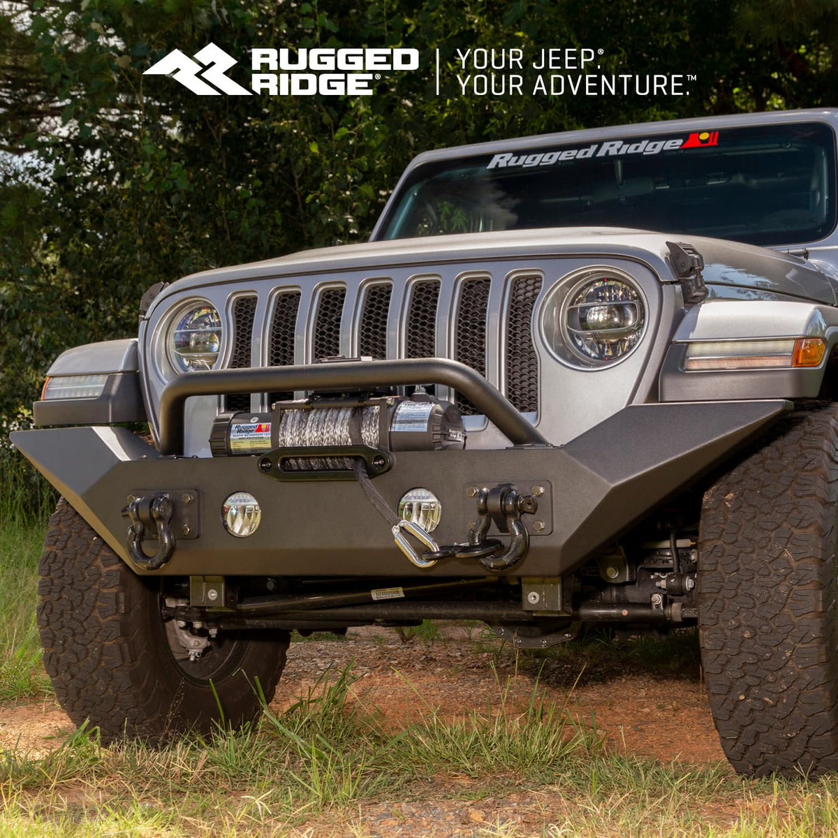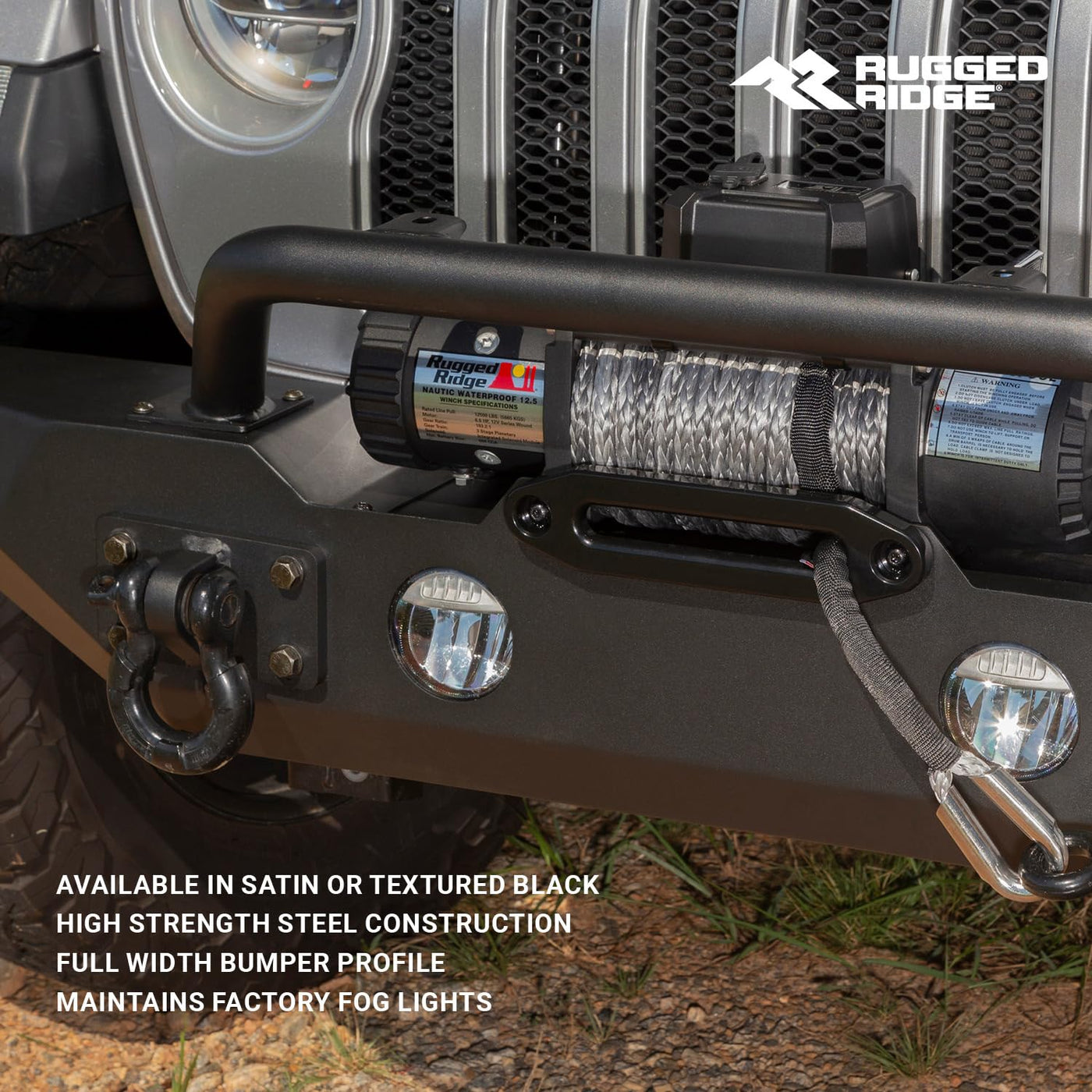 Q: What are the key features of the Rugged Ridge Spartan front bumper?A: The Rugged Ridge Spartan front bumper features a full-width design with high-clearance ends, a heavy-duty winch plate, D shackle mounts, and a rugged textured black powder coat finish for durability and style.