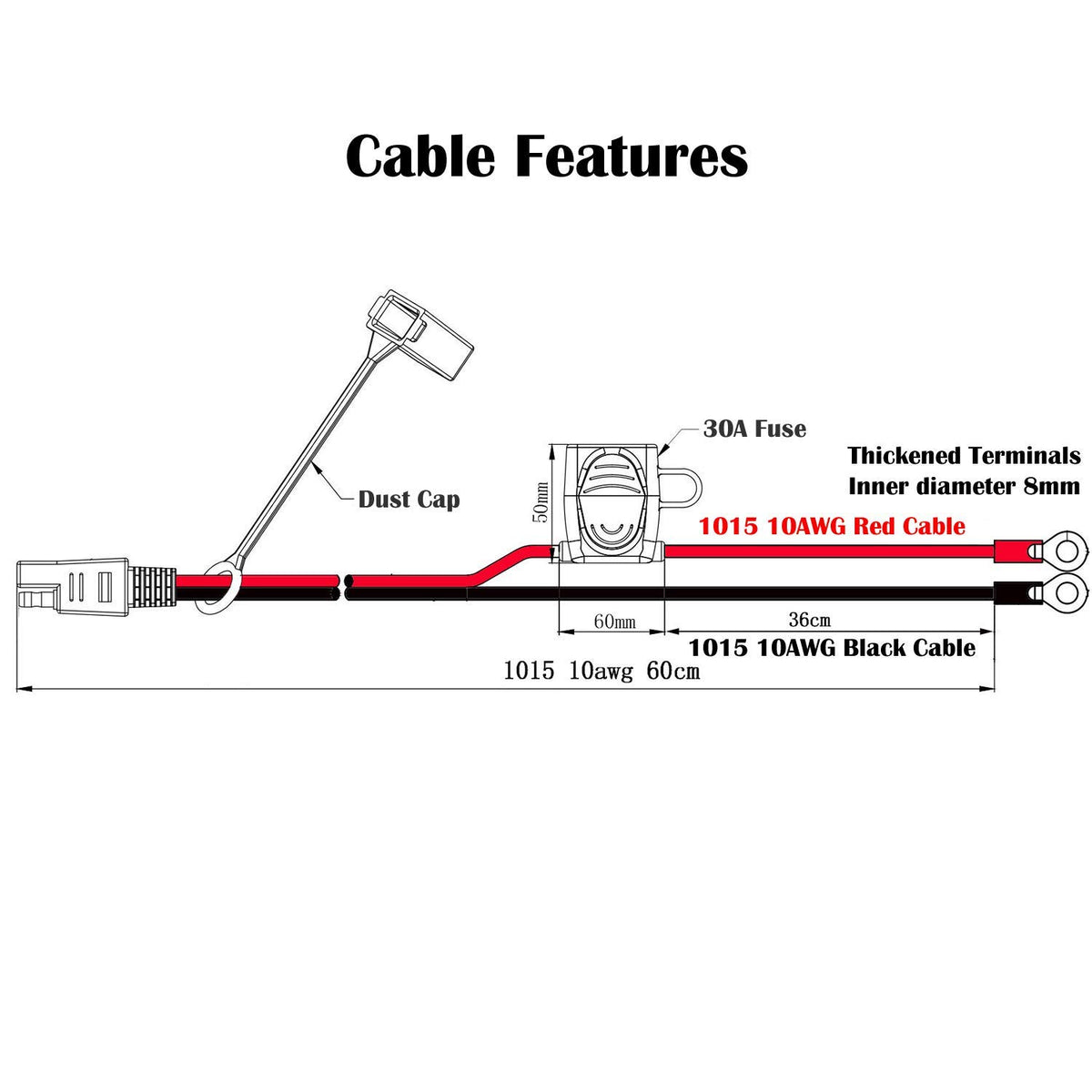 Q: What is the gauge and length of the SAE battery connector?A: The SAE battery connector features a heavy-duty 10 AWG wire and has a total length of 2 feet (60 cm), making it suitable for various applications.