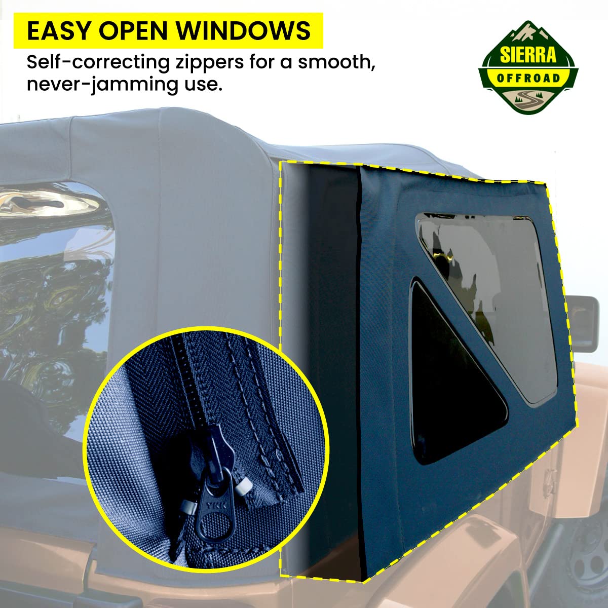 Q: Are the tinted windows easy to handle on the Sierra Offroad Soft Top?A: Yes, the soft top features easy open tinted windows with self-correcting YKK zippers, allowing for smooth operation without the risk of jams, making it easy to roll up the windows when you want to enjoy the breeze.