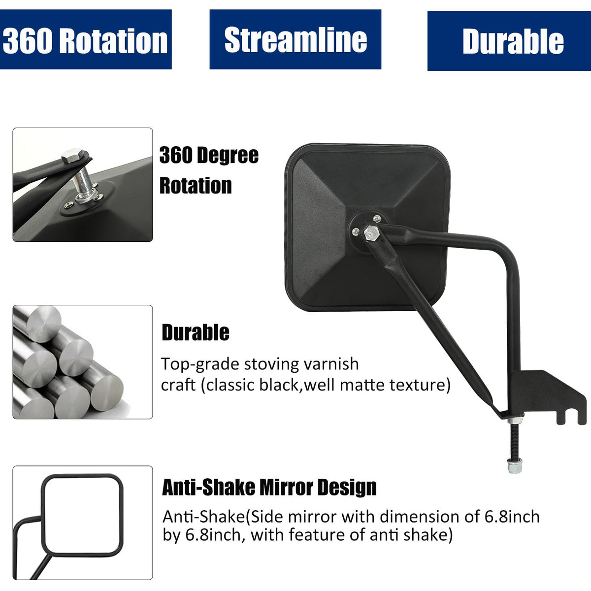 Description The Jeep Wrangler doors-off mirror system is an essential accessory for Jeep owners who enjoy driving with the doors removed while maintaining optimal safety and visibility. When removing the doors, it is crucial to replace or relocate the vehicle's standard side mirrors to comply with road safety regulations and ensure an unobstructed view of surrounding traffic.