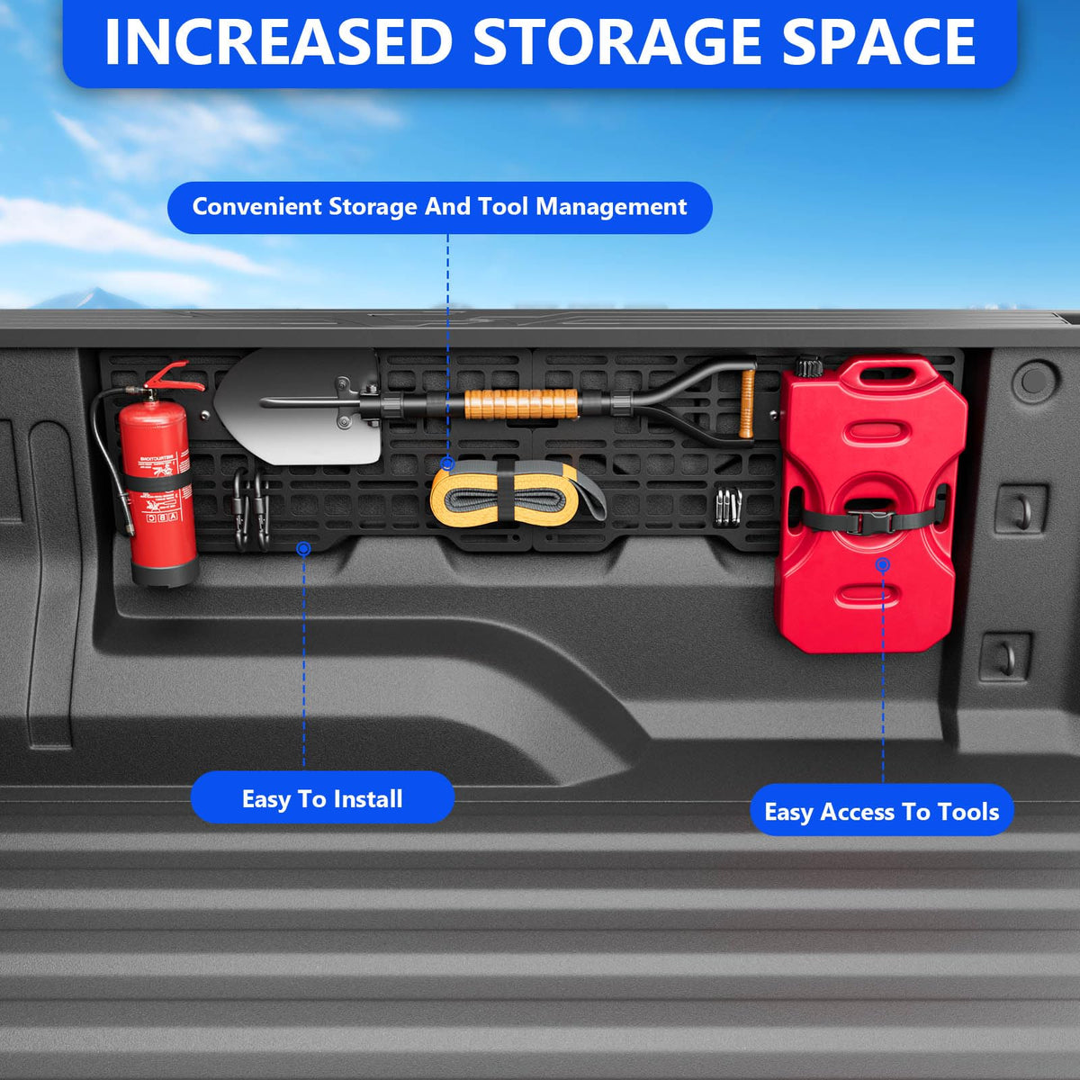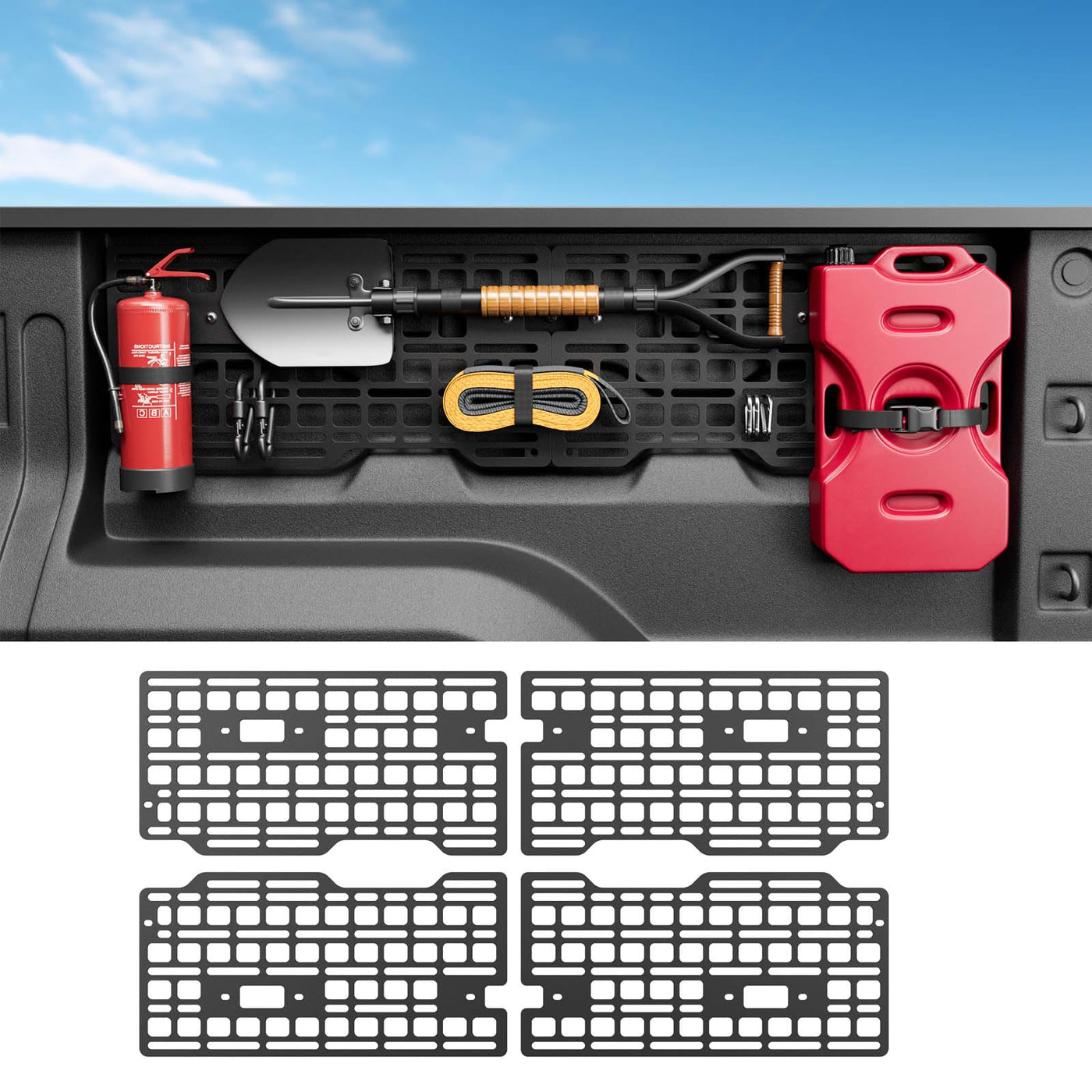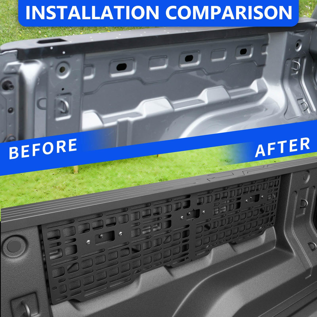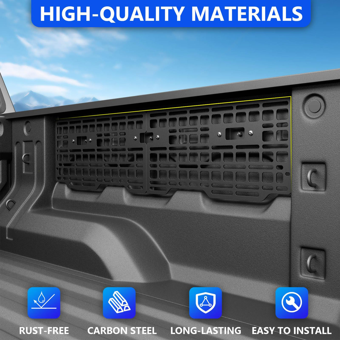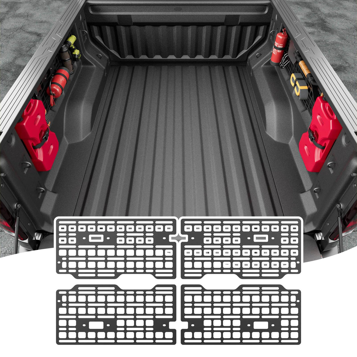 Fitment:The side bed molle panels are perfectly compatible with 2023 2024 2025 Chevy Colorado and GMC Canyon.They will fit the original truck well.Note:they are ONLY compatible with 5FT short bed!!!Please confirm the size before purchasing. Premium Material: The truck molle panels are made of high-strength carbon steel which can withstand up to 300 lbs and will not deform even when an adult stands on it. They can be used for a long time. Practical Function:The bed molle panels can hold a variety of tools, such as off-road equipment high lift jacks,axes,shovels,flashlights,off-road gear,etc.They will expand storage space and prevent items from sliding around during the driving process. Installation:We attach the installation reference video on the product page.In the package of the product, we also printed the installation video QR code on the instruction manual, please scan the code to view.You will install them quickly and smoothly. After-sale Service: If you have any question with 2023 2024 2025 Chevy Colorado and GMC Canyon 5FT short side bed model panels, please contact us at any time. We will solve problems for you as soon as possible.