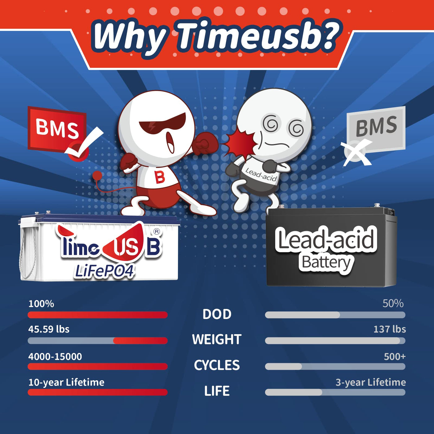 Q: What are the advantages of using a 24V 100Ah LiFePO4 battery compared to traditional lead-acid batteries?A: The Timeusb 24V 100Ah LiFePO4 battery offers several advantages over lead-acid batteries, including a longer lifespan of over 4000 cycles, which is four times more than lead-acid options. It also has a lighter weight, is more compact, has a built-in Battery Management System (BMS) for enhanced safety, and provides better performance with higher energy density.