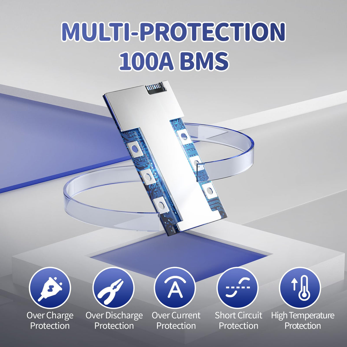 Q: How does the built-in BMS enhance the safety of this battery?A: The built-in Battery Management System (BMS) of the Timeusb 24V 100Ah battery protects against overcharge, over-discharge, over-current, short circuits, and high temperatures, ensuring safe operation and prolonging the battery's lifespan.