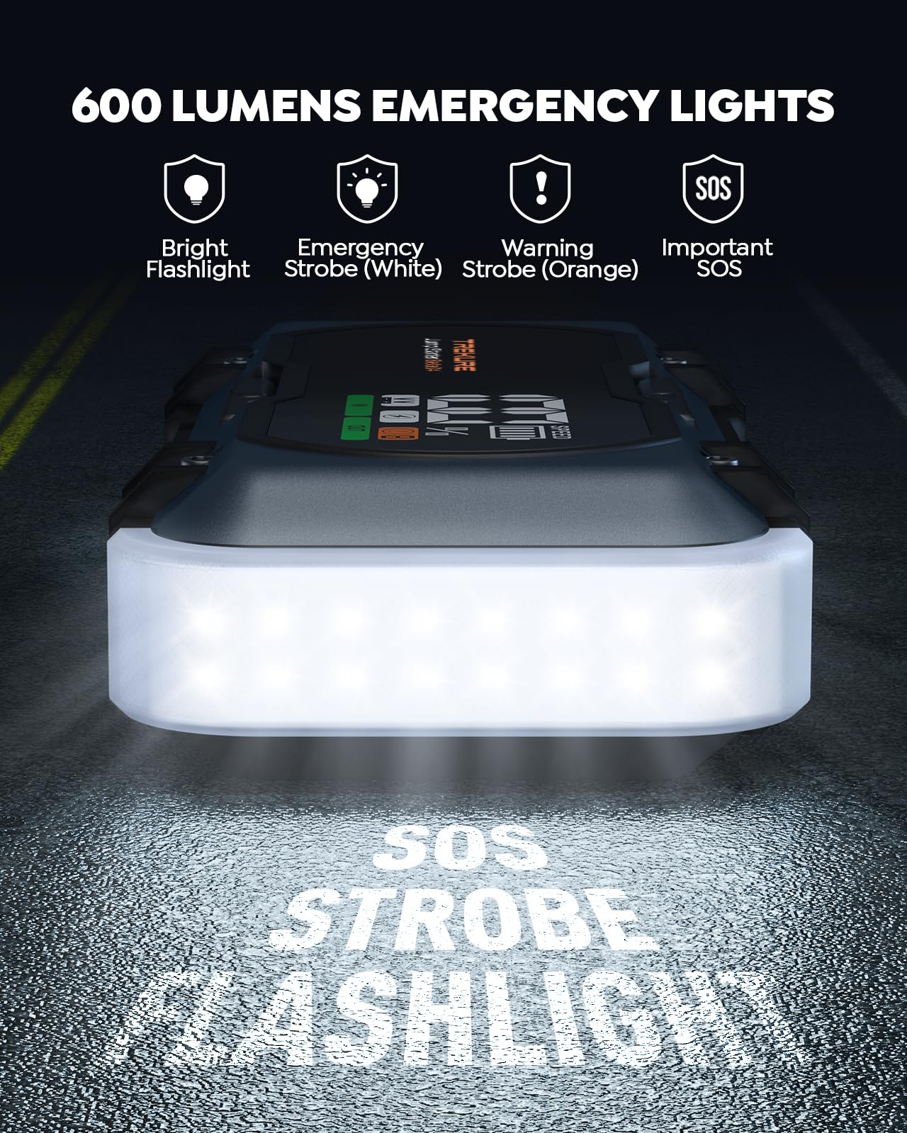 Q: What extra features does the TREKURE jump starter offer besides jump-starting?A: In addition to jump-starting, the TREKURE jump starter functions as a portable power bank, features a 600 lumens LED emergency light with multiple modes, and includes USB ports for charging devices, making it a versatile tool for emergencies.