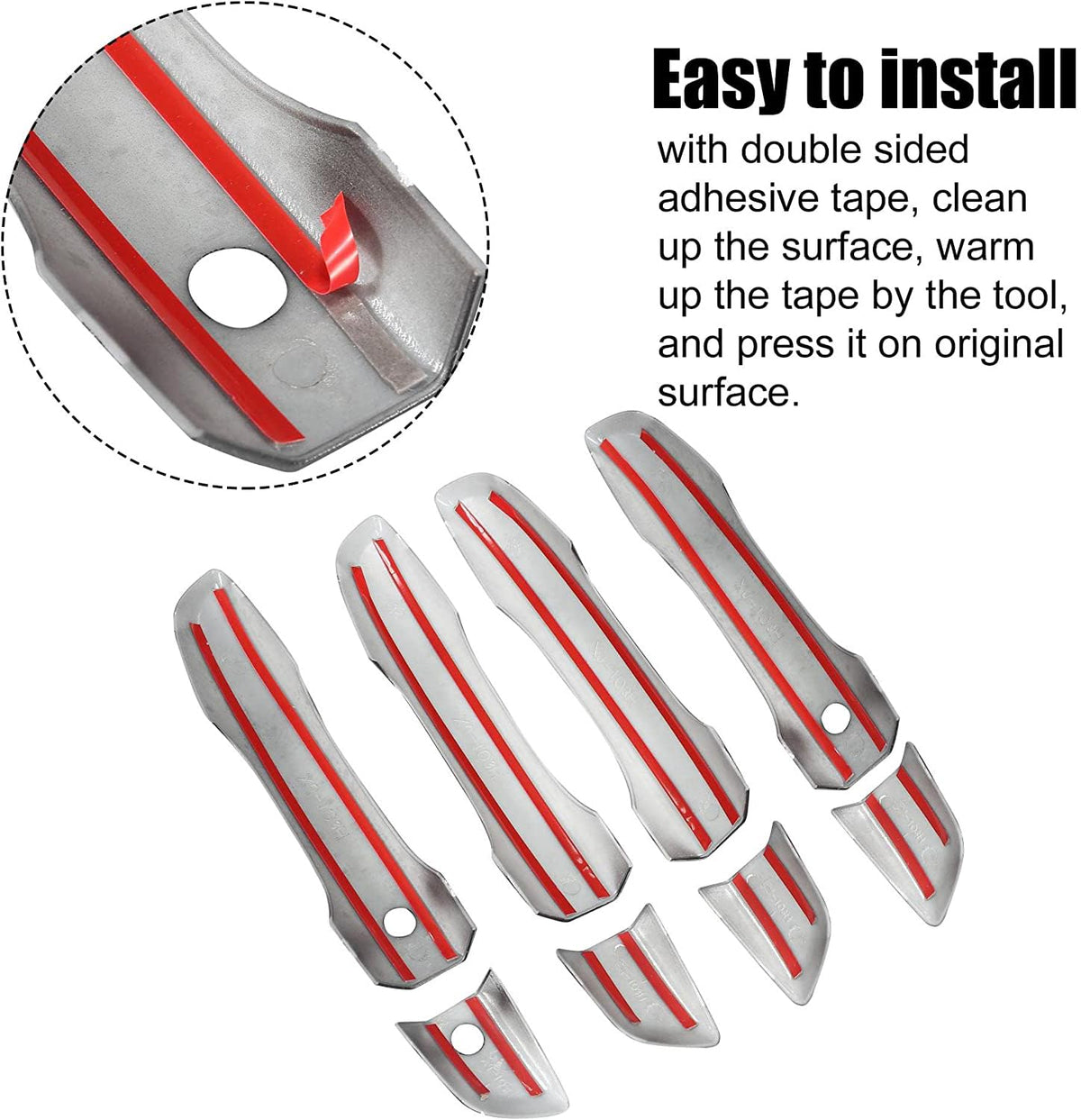 Q: How do I install the door handle trim covers?A: Installation is straightforward. Clean the surface of the original door handle, warm up the double-sided adhesive tape with a tool, and press the trim cover firmly onto the surface for a secure fit.
