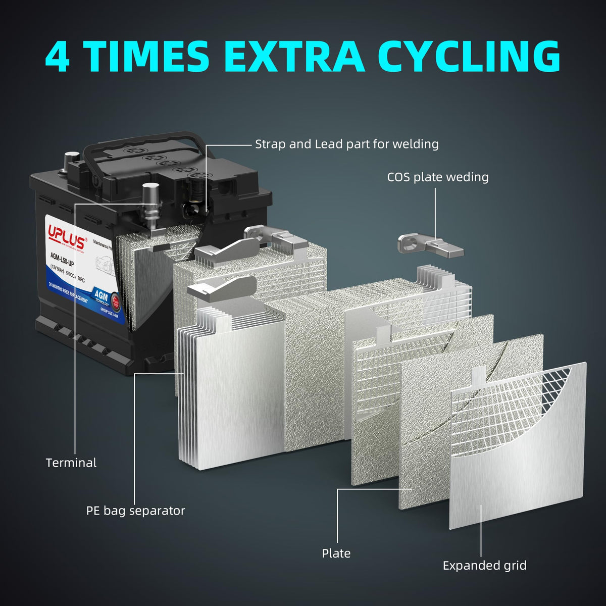 4 Times Extra Cycling Life: Featuring high-density negative paste and enhanced life alloy, the UPLUS battery offers four times the cycle life compared to standard conventional batteries, ensuring longevity and reliability.