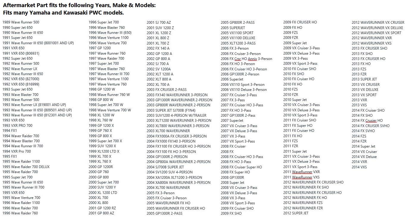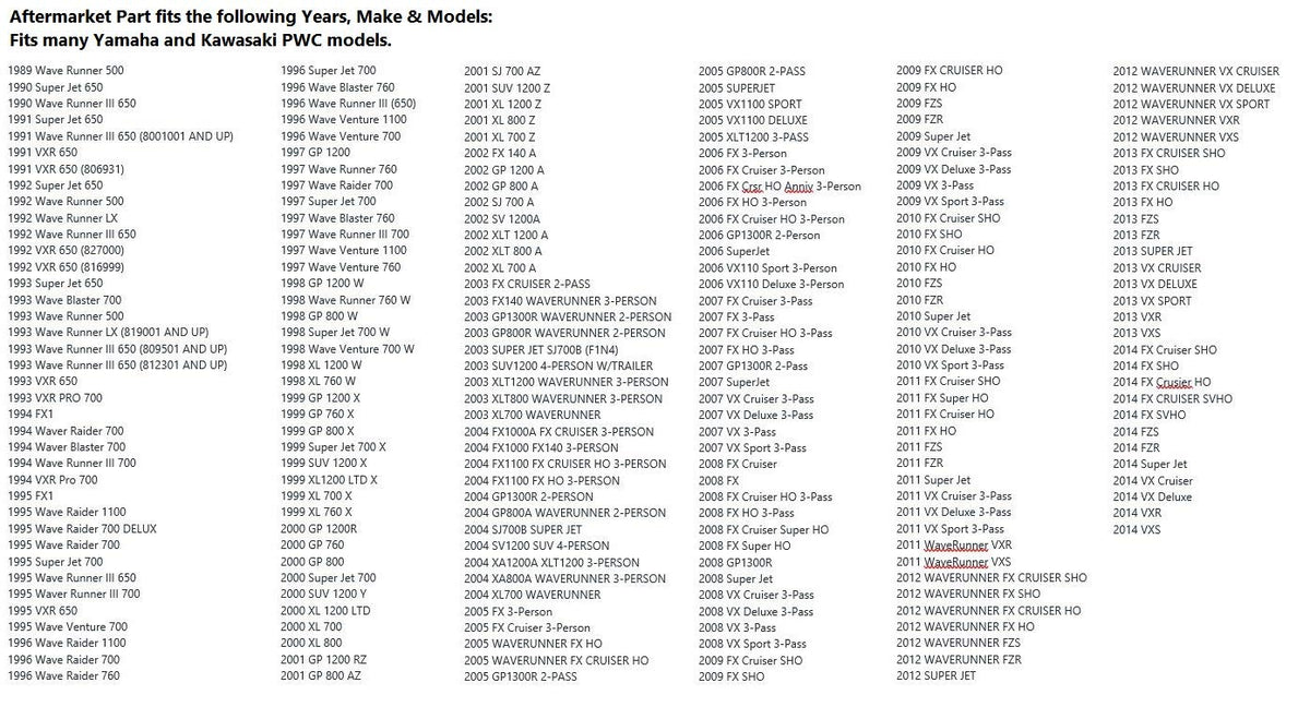 Q: Is the Yamaha Kawasaki Jet Ski Kill Switch Lanyard compatible with my model?A: This aftermarket kill switch safety lanyard is compatible with many Yamaha and Kawasaki PWC models, including 1992-2003 Kawasaki Jetski models such as 750, 900, 1100, ZXI, and Yamaha WaveRunners like 140, 500, 650, 700, 760, 800, 1100, 1200, and 1300. Please check your part number and model specifications before ordering.