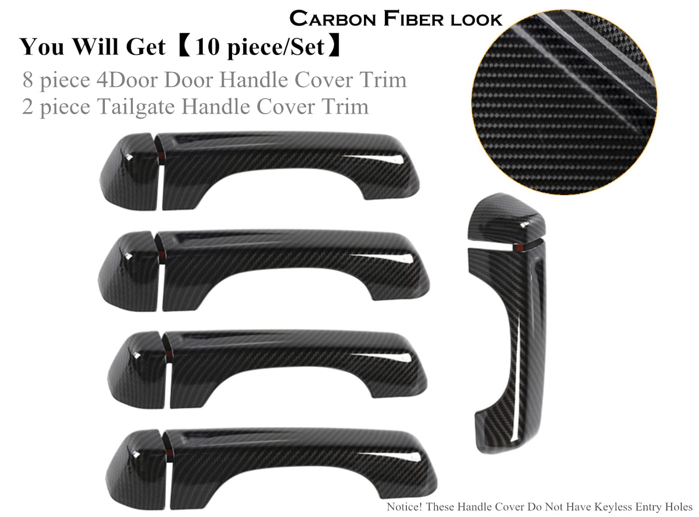 Q: What material is the door handle cover made from?A: The door handle cover is made from high-quality Acrylonitrile Butadiene Styrene (ABS), providing durability and a sleek carbon fiber look.