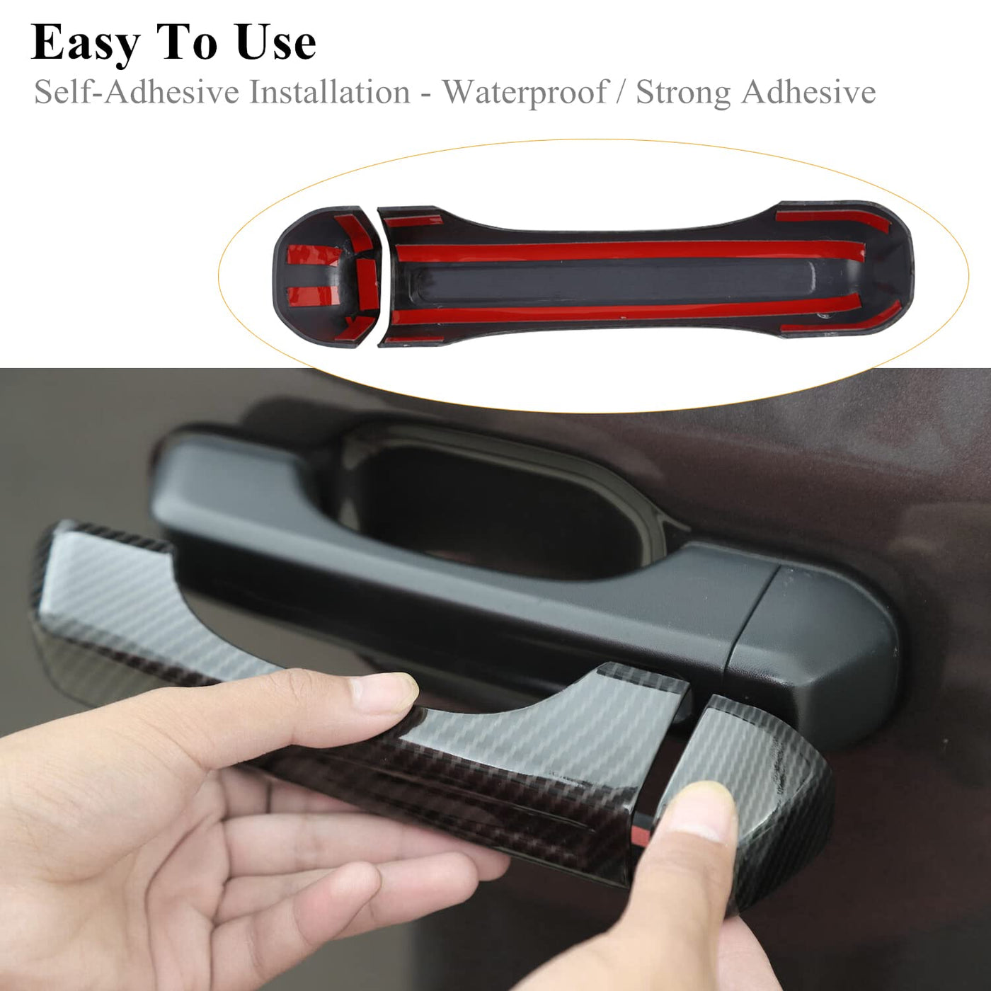 Q: How do I install the door handle cover?A: Installation is easy with the included 3M automotive-grade tape. Ensure the installation area is clean and dry, position the trim correctly, peel off the adhesive backing, and press firmly for secure adhesion.