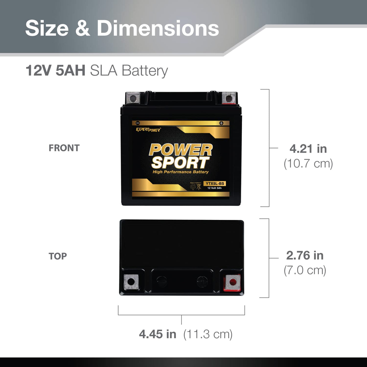 Q: What are the key features of the YTX5L-BS battery?A: This battery is a maintenance-free, sealed lead acid type with a voltage of 12V and a capacity of 5Ah. It provides 75 A Cold Cranking Amps (CCA) and includes dimensions of 4.45 inches in length, 2.72 inches in width, and 4.13 inches in height.