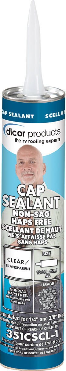 Dicor 351CSCL-1 HAPS-Free Cap Sealant - Clear is the ultimate solution for RV window and door maintenance, ensuring a tight, reliable seal around your RV's windows, entry doors, compartment doors, and joints. This high-quality, non-sag sealant is available in Clear, White, Black, and Tan, providing excellent UV and water resistance to protect your RV from the elements.