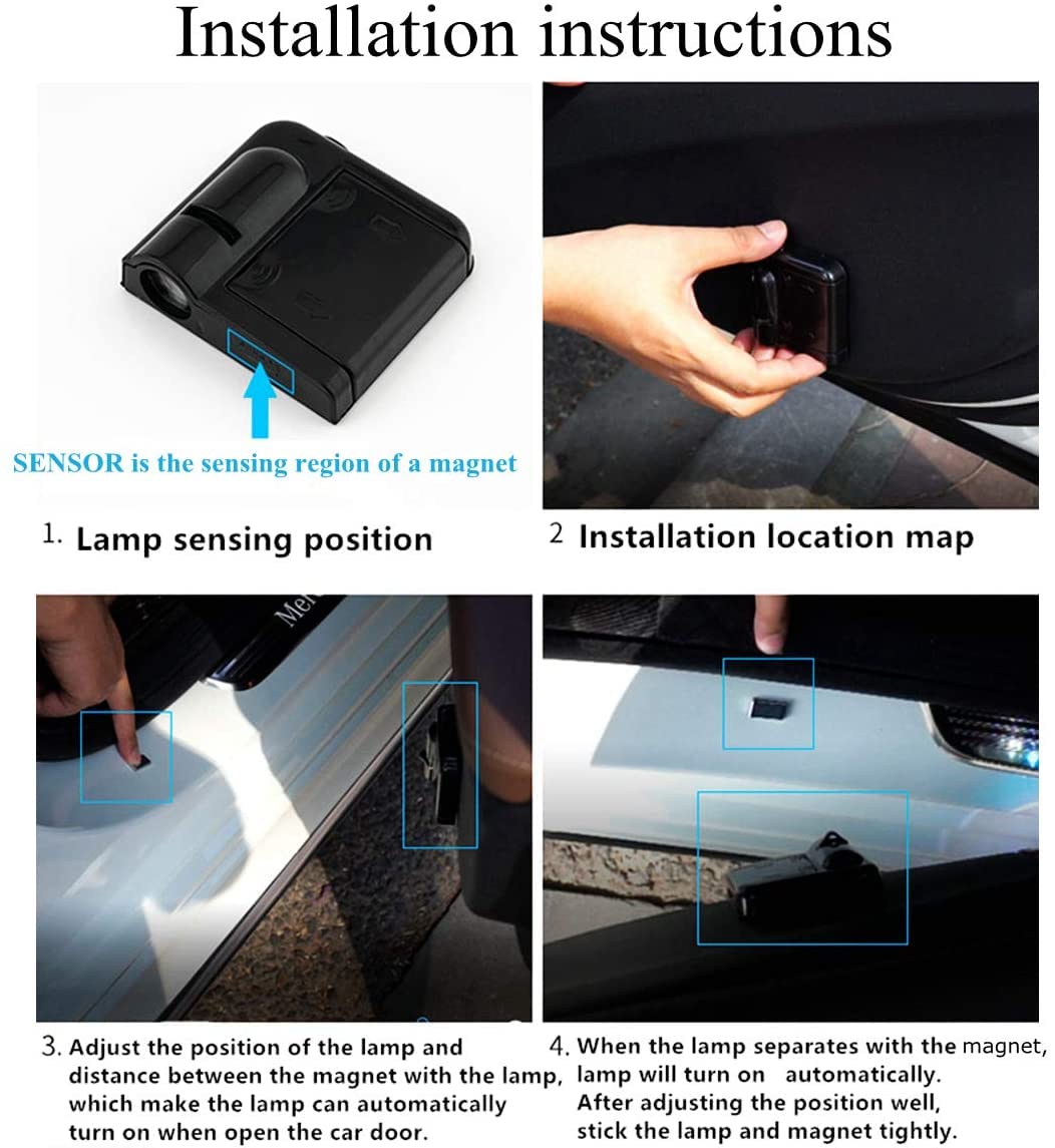 Q: How do I install the Car Door Lights Logo Projector?A: Installing the Car Door Lights Logo Projector is simple and can be done in under 5 minutes. First, ensure the car threshold is clean and dry. Insert 3 AAA batteries into the battery case. Then, position the light housing and magnet according to your car's flame before sticking them in place. Finally, adhere the magnet to the car threshold and the light to the car door, maintaining a distance of about 10mm.