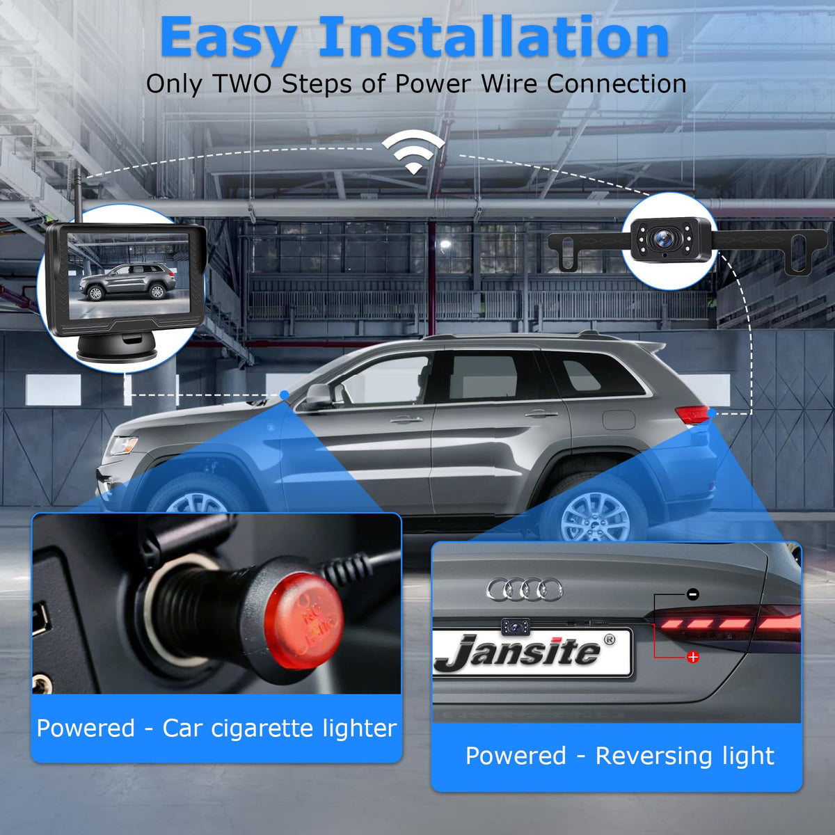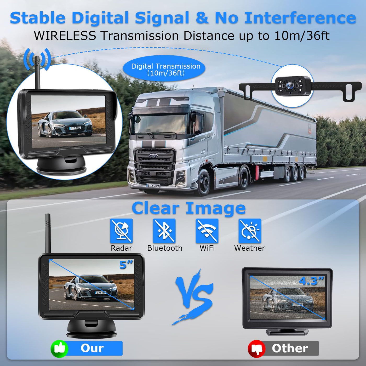 Q: How does the wireless connection work for the backup camera?A: The wireless backup camera uses point-to-point transmission technology, ensuring a stable signal without interference from other devices. This allows for easy installation without running long cables from the camera to the monitor.