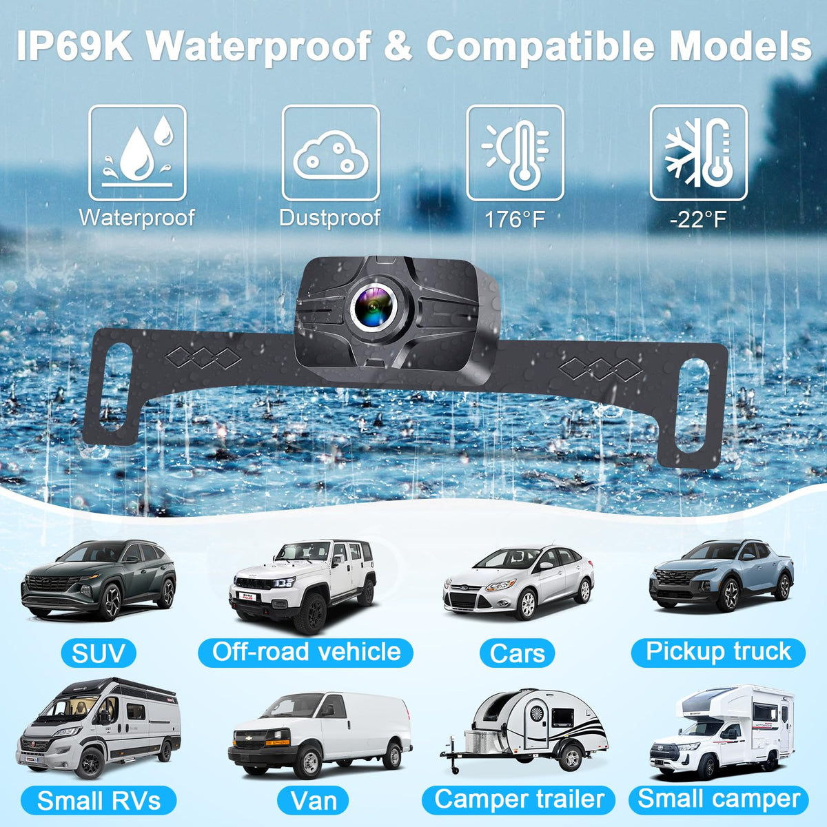 Q: Is the backup camera waterproof?A: Yes, the backup camera has an IP69 waterproof rating, making it durable and reliable in various weather conditions, including heavy rain and extreme temperatures.