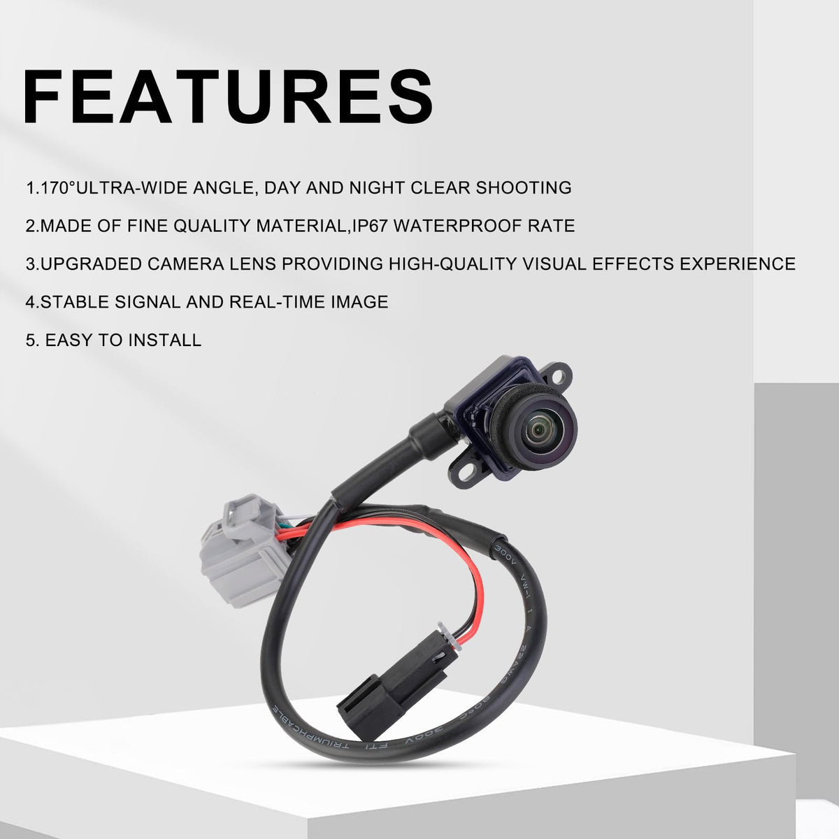 Q: What are the key features of this backup camera?A: This backup camera features a 170° ultra-wide angle lens for a comprehensive view, IP67 waterproof housing for durability in harsh weather conditions, and is designed for easy installation.