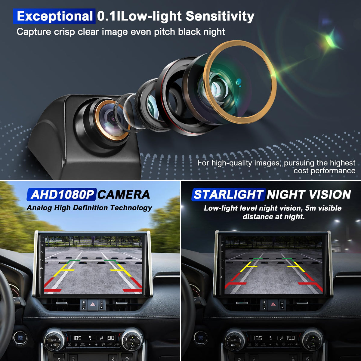 Q: What makes the 1080P HD backup camera ideal for low-light conditions?A: The 1080P HD backup camera features built-in 6 glass lenses and upgraded chips that restore 100% of true colors, providing vivid and lifelike images in low-light conditions, ensuring safer night driving.