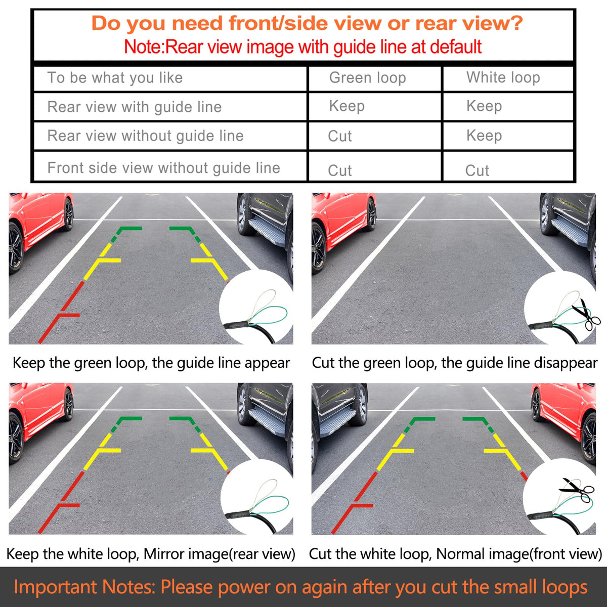 Q: Does the RAAYOO backup camera support front view functionality?A: Yes, the RAAYOO backup camera includes built-in multifunctional switching loops that allow you to switch between rear view with guide lines and front view by cutting the appropriate loop.